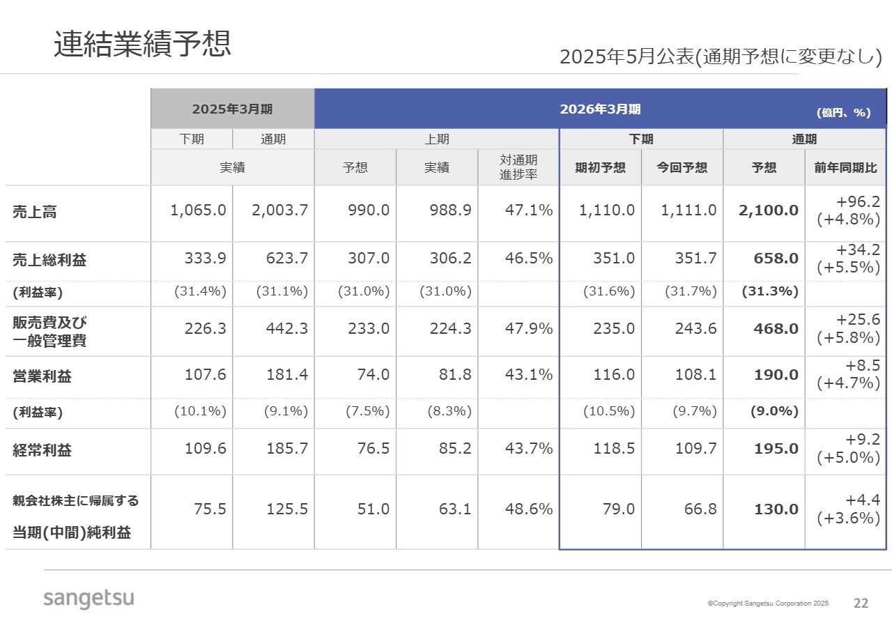 その上での連結業績予想です。先ほどお伝えした事業環境等が期初想定よりも厳しい見通しとなるマイナス影響や、上期に特別利益が計上されたプラス影響などを総合的に考慮し、売上高2,100億円、営業利益190億円、親会社株主に帰属する当期純利益130億円を据え置いています。