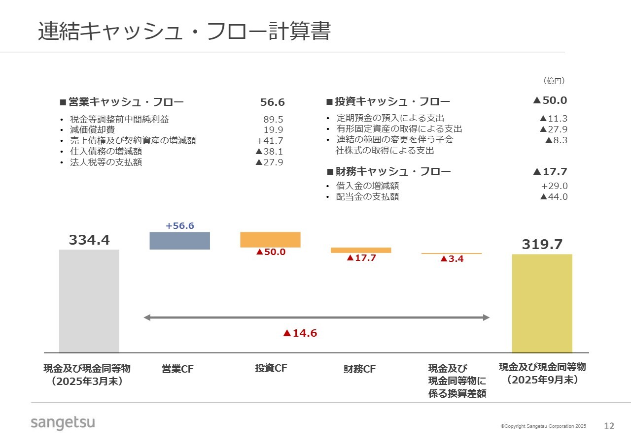 連結キャッシュ・フローについてです。仕入先との対話を通じた適切な対応や一部商流の変更に伴い、仕入債務の減少がありましたが、業績予想の達成やサプライチェーンマネジメントの強化を通じて、引き続きキャッシュ創出力を高めていきたいと考えています。