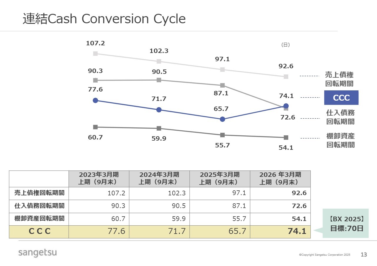 連結Cash Conversion Cycle(CCC)についてです。売上債権の回転期間はキャッシュ・フローの改善に見られるように、営業現場での取り組みを通じて改善が進んでいます。仕入債務の回転期間については、引き続ききめ細かく対応しています。