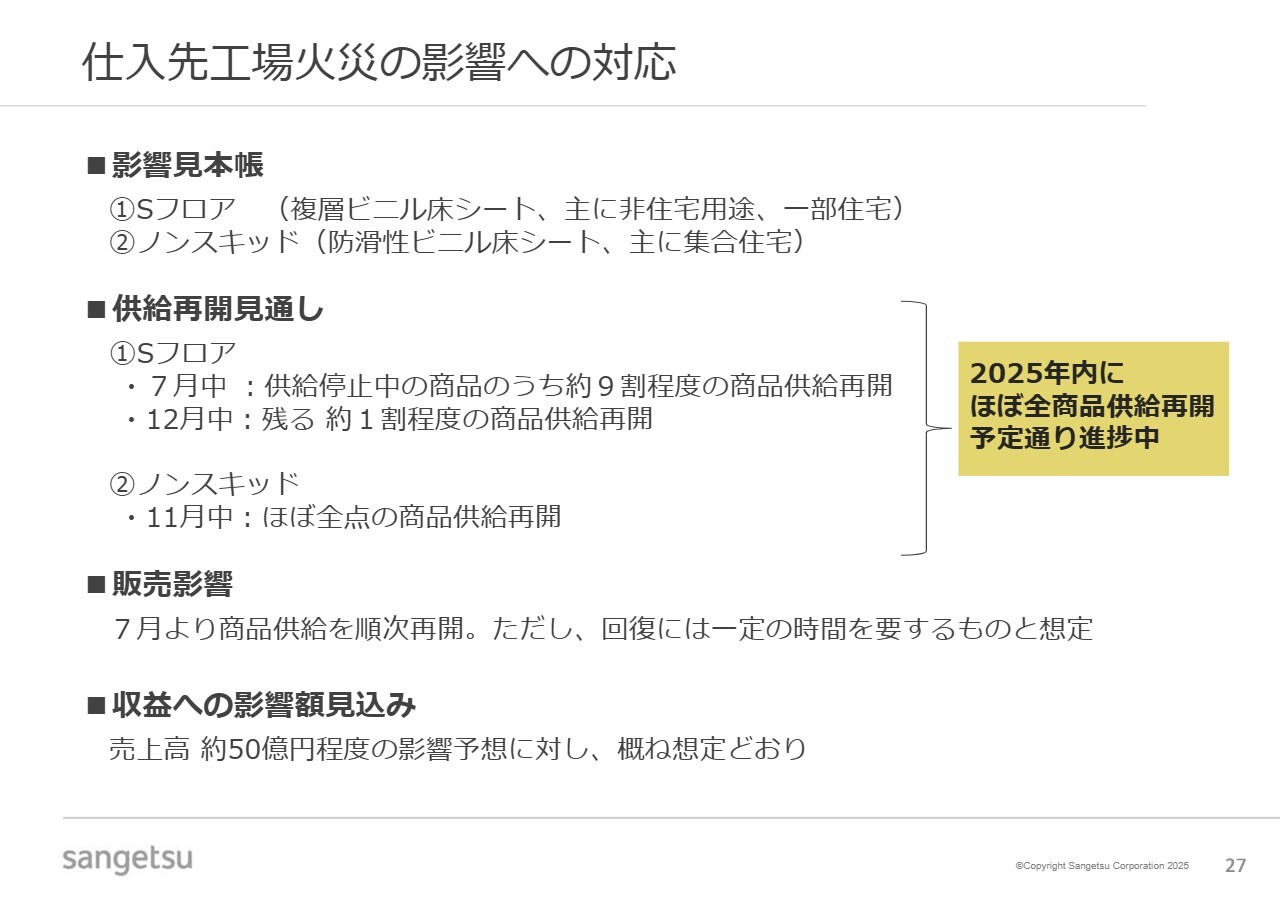 また、代替商品を確保することで、顧客への供給責任を果たしてきました。スライドに記載のとおり、全商品の供給は2025年内に再開される見込みです。