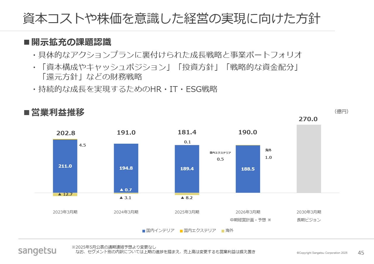 底堅いインテリア事業に対して、エクステリア事業、空間総合事業、海外事業の3事業については、定量面で計画に達していないものの、課題が明確になりつつあります。