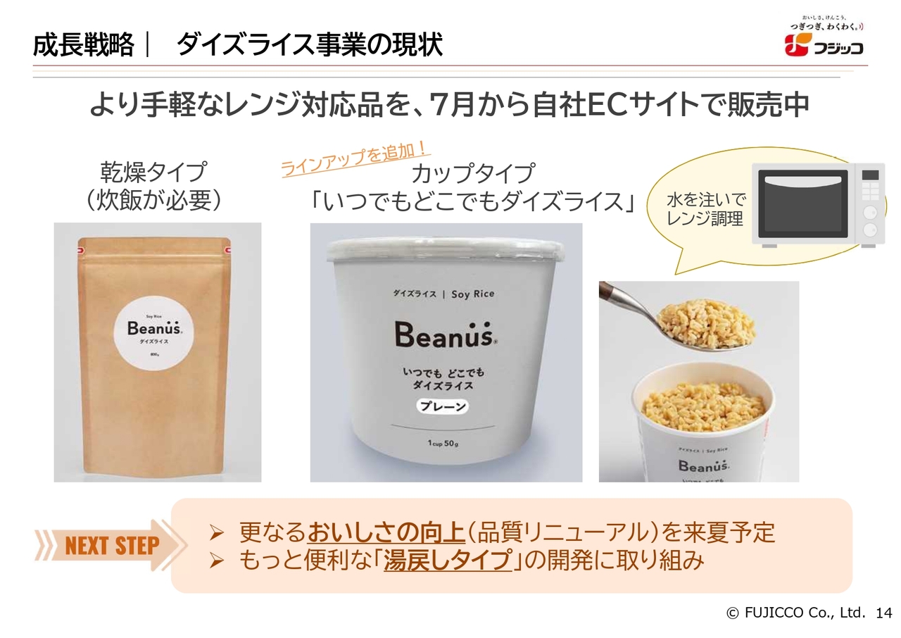 大豆関連商品として、2021年から「ダイズライス」を発売しています。現在のところ成長は緩やかですが、本年7月には、レンジアップが可能な商品として、より簡単で便利な仕様に改良したカップタイプの商品を発売しています。