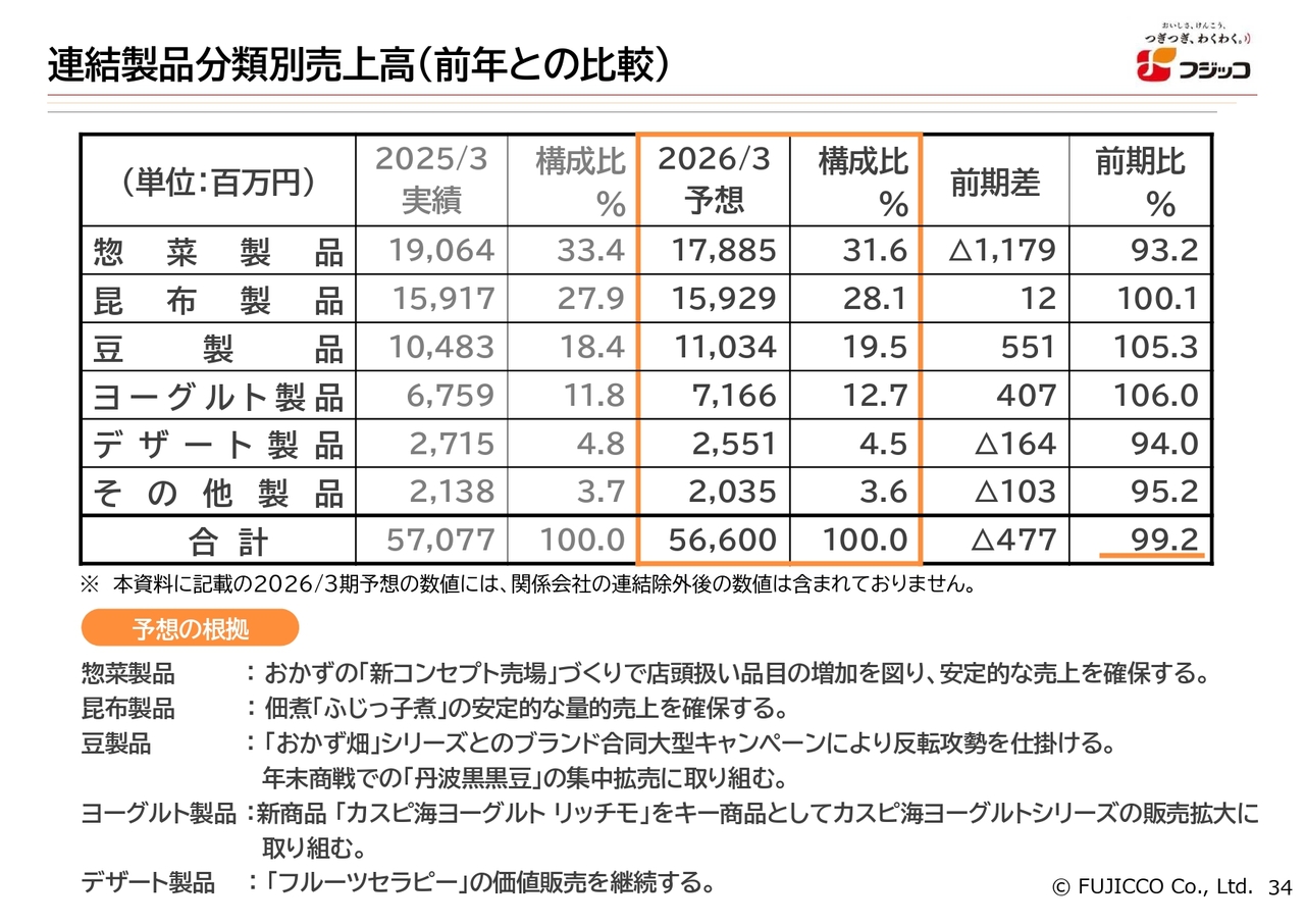 連結製品分類別の売上高の前年との比較です。表では商品群が縦に並んでいますが、前年と比較して昆布製品とヨーグルト製品が増加しました。一方、惣菜製品、豆製品、デザート製品はマイナスとなりました。
