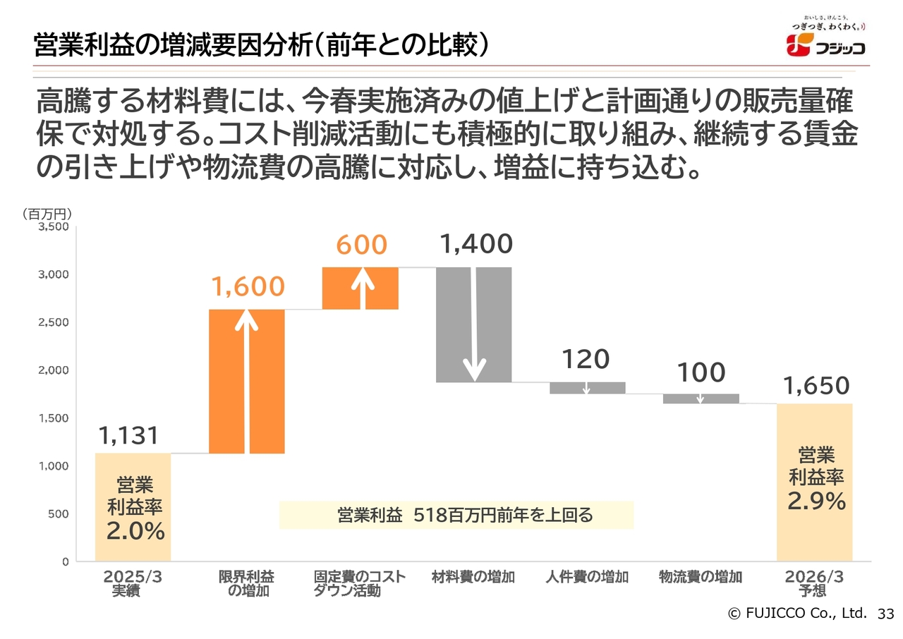 一方、マイナス要因として材料費が14億円増加していますが、限界利益の増加や値上げにより取り戻す算段です。また、人件費が1億2,000万円、物流費が1億円増加しています。これらを踏まえ、営業利益は16億5,000万円を見込んでいます。