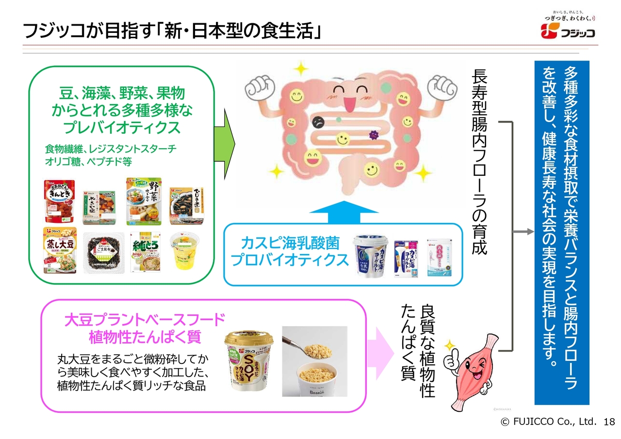 そのため、今後はおかず類、「カスピ海ヨーグルト」を軸にしたヨーグルト商品、さらに大豆を活用したプラントベースフードなどを推進していきます。大豆、海藻、ヨーグルトの良さを世界に広め、健康長寿社会の実現に貢献していきます。