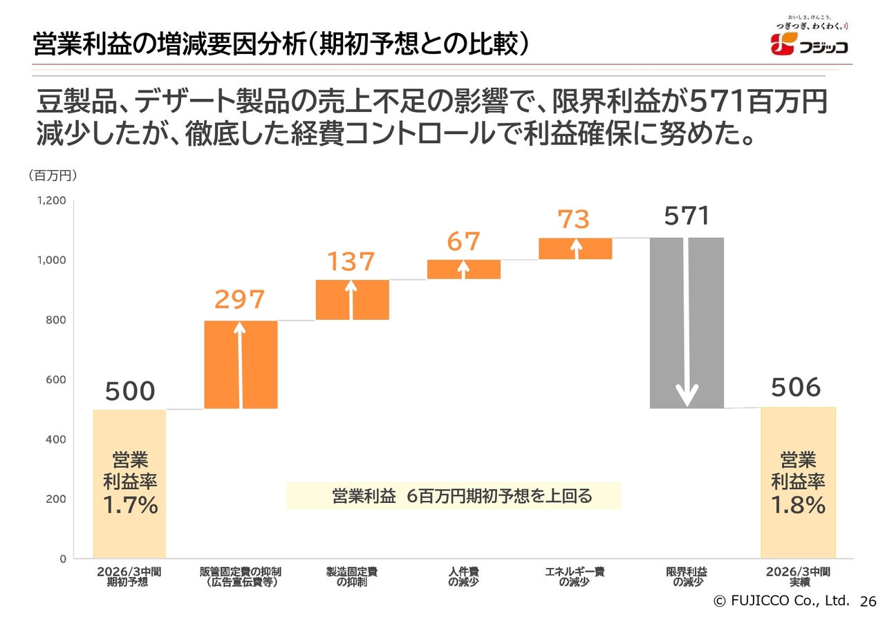 一方、マイナス要因として売上減少による限界利益の減少が5億7,100万円発生し、最終的な営業利益は5億600万円となりました。