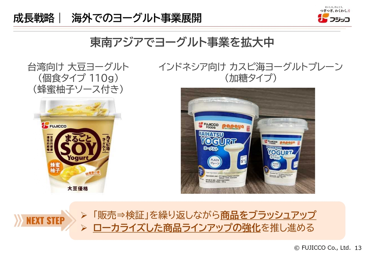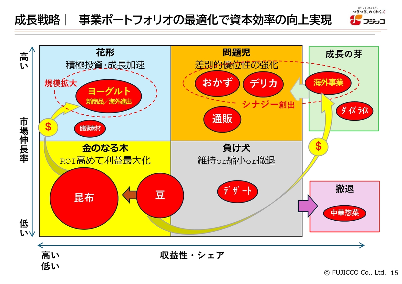 また、「問題児」であるおかずやデリカ、通販事業などを早急に「花形」へ移行できるよう取り組んでいます。「成長の芽」である海外事業については、ヨーグルト事業と同様に、さらなる拡大を目指しています。