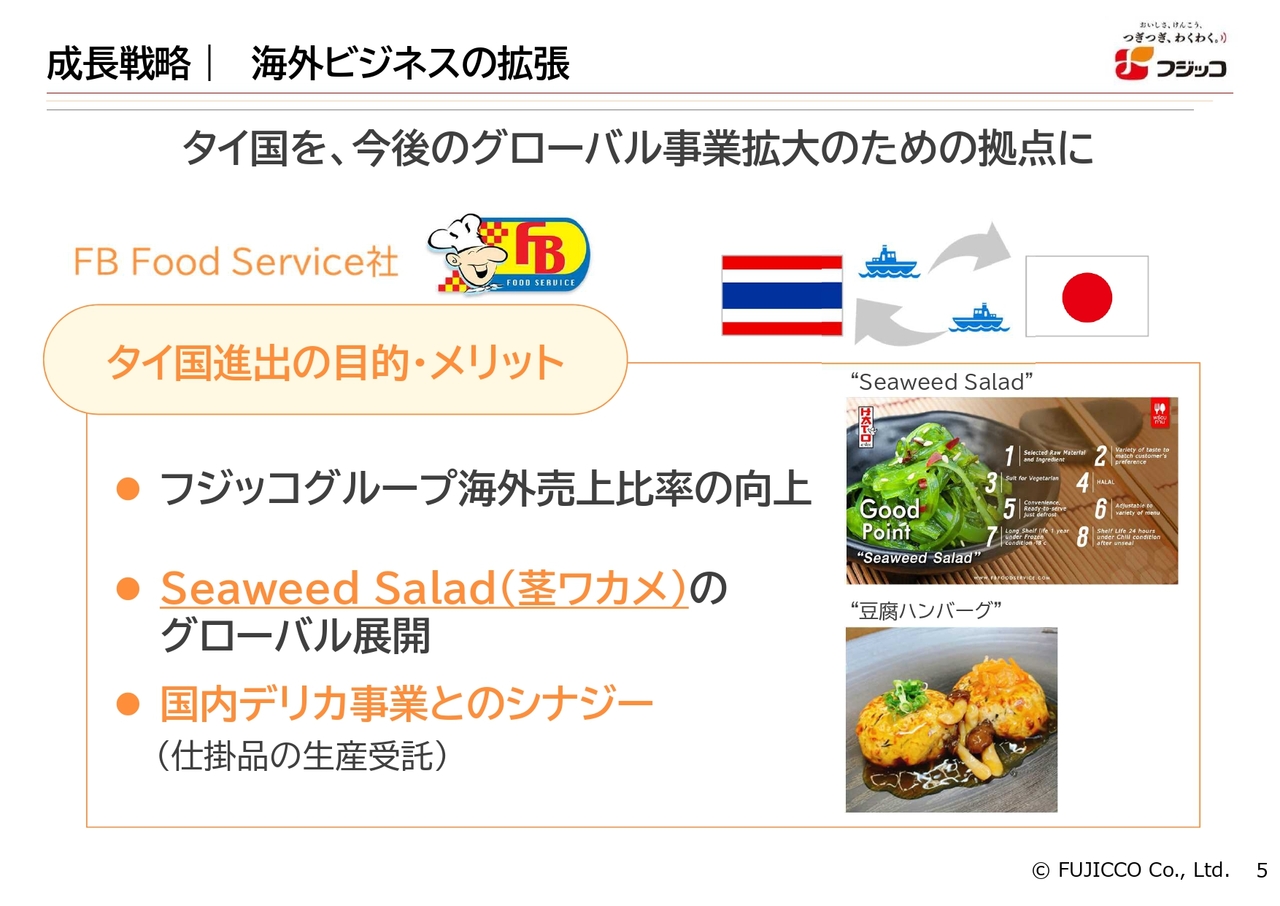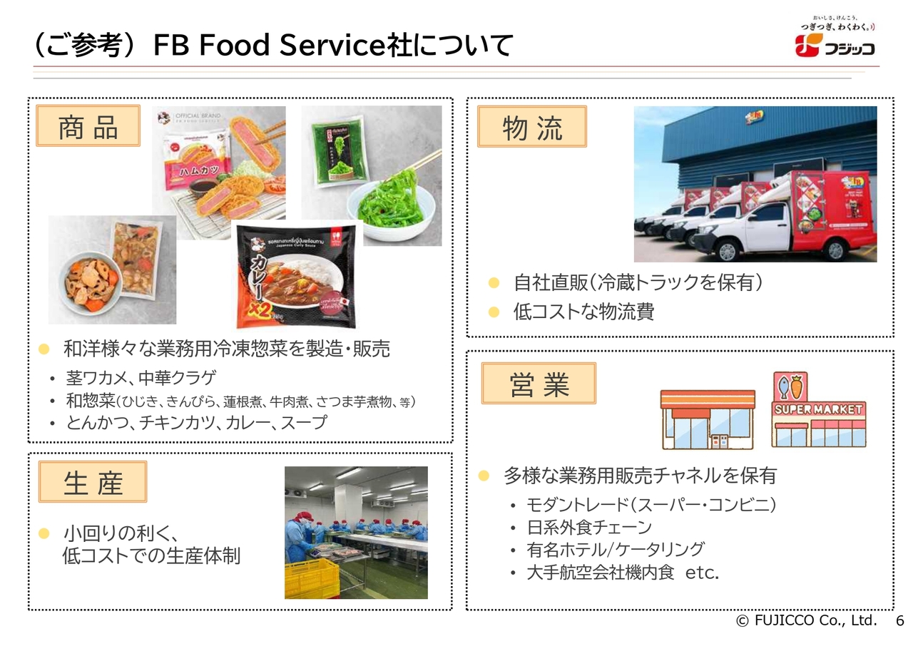 また、当社の国内事業であるデリカ事業において、タイで製造した製品を冷凍で運び、日本国内で販売するビジネスモデルを今後構築しやすい点もFB Food Service社を買収した理由の1つです。