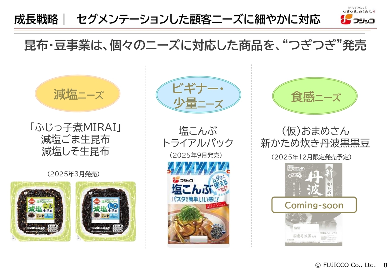 成長戦略の一環として、新しい商品を市場に投入しました。まず、減塩ニーズに応える「減塩タイプの昆布の佃煮」です。この商品は「ふじっ子煮MIRAI」シリーズとして展開しており、冷凍生昆布を使用しています。