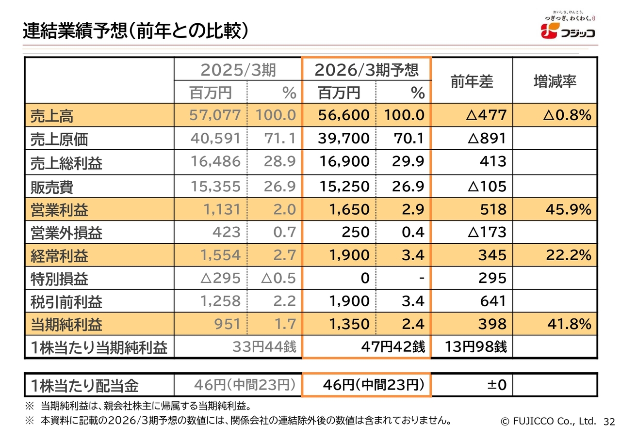 1株当たりの配当金は46円で、据え置きを計画しています。