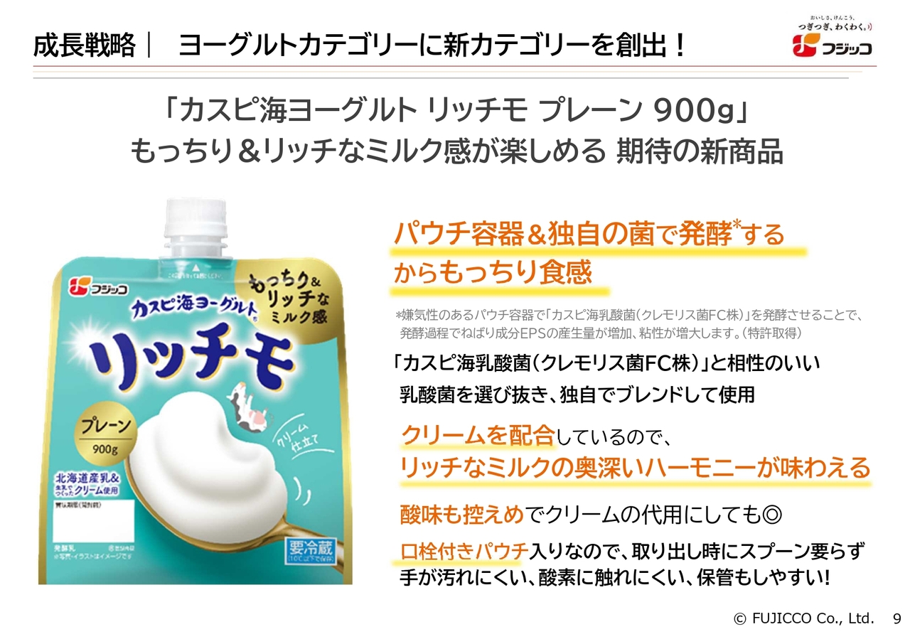 新しいヨーグルトカテゴリーを創出すべく「リッチモ」を9月末に発売しました。この商品の特徴は「カスピ海ヨーグルト」の乳酸菌に加え、もう1つ別の乳酸菌を加えて発酵させている点です。その結果、非常にもっちりとした食感が生まれています。