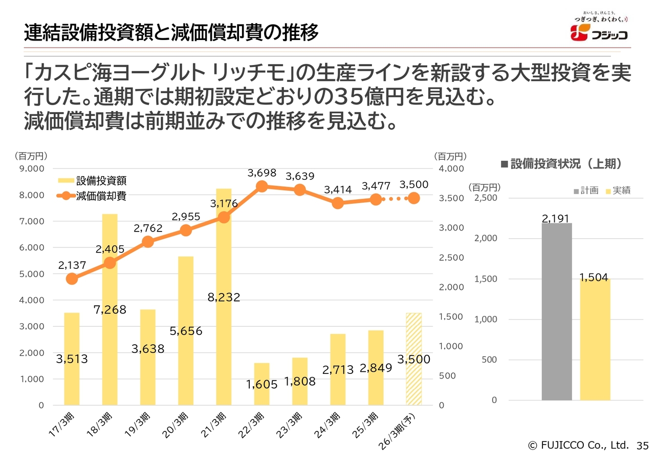 最後に、連結の設備投資額と減価償却費の推移をご報告します。今期の設備投資は35億円を予定しています。この中には、この秋に発売した「カスピ海ヨーグルト リッチモ」の北海道工場における新設備の投資や、好調に推移している「まるごとSOYカスピ海ヨーグルト」の増産設備への投資などが含まれています。減価償却費は35億円です。