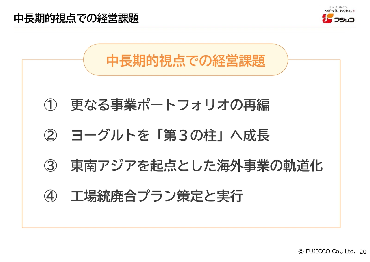 経営課題をまとめています。1つ目は、さらなる事業ポートフォリオの再編です。2つ目は、ヨーグルトを「第3の柱」として成長させることです。3つ目は、東南アジアを起点とした海外事業の軌道化です。そして4つ目は、工場統廃合プランの策定と実行です。これらの取り組みを着実に進めていきます。