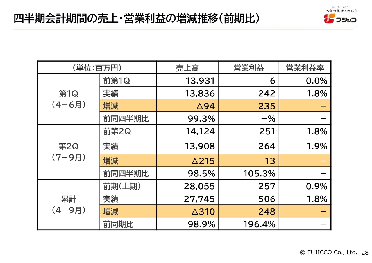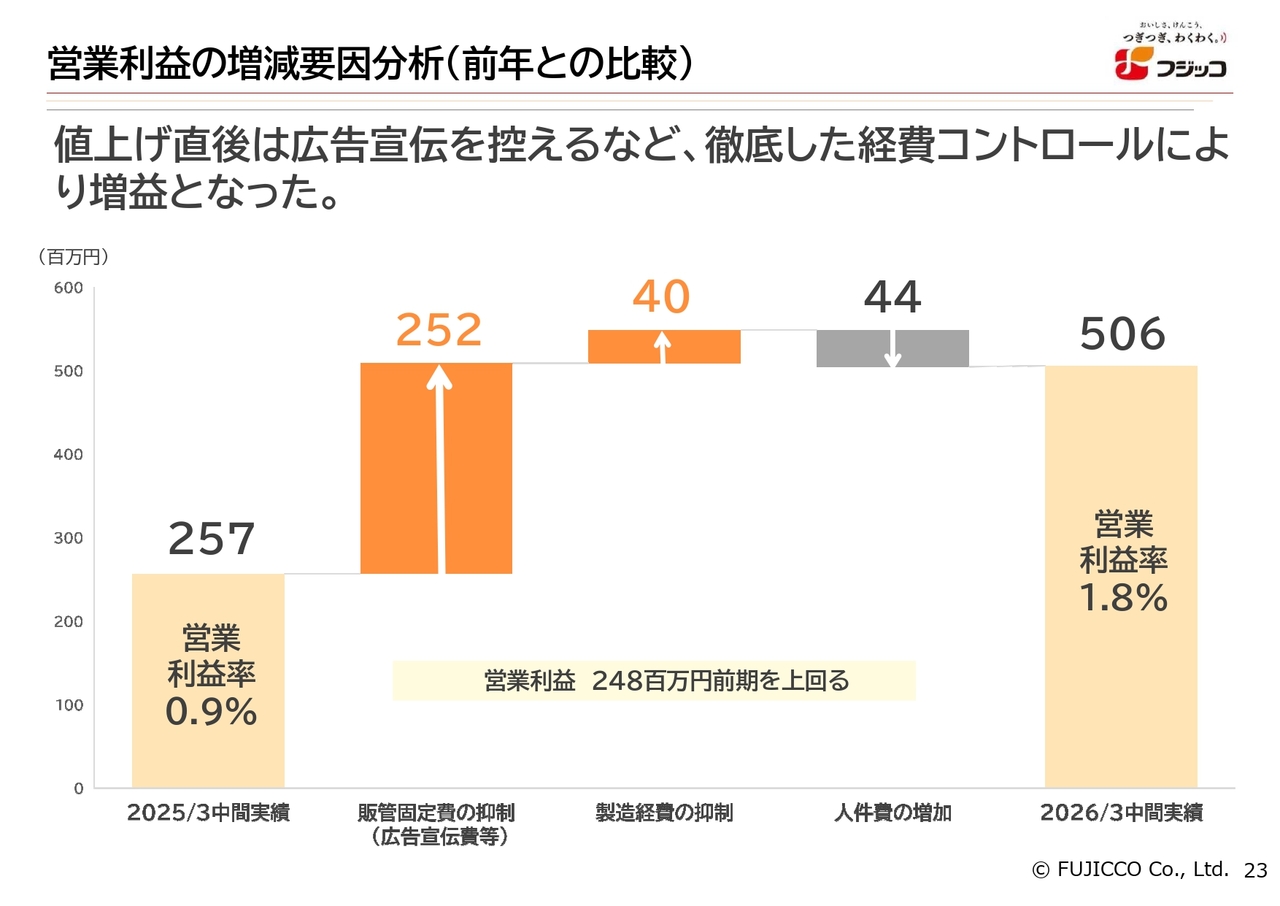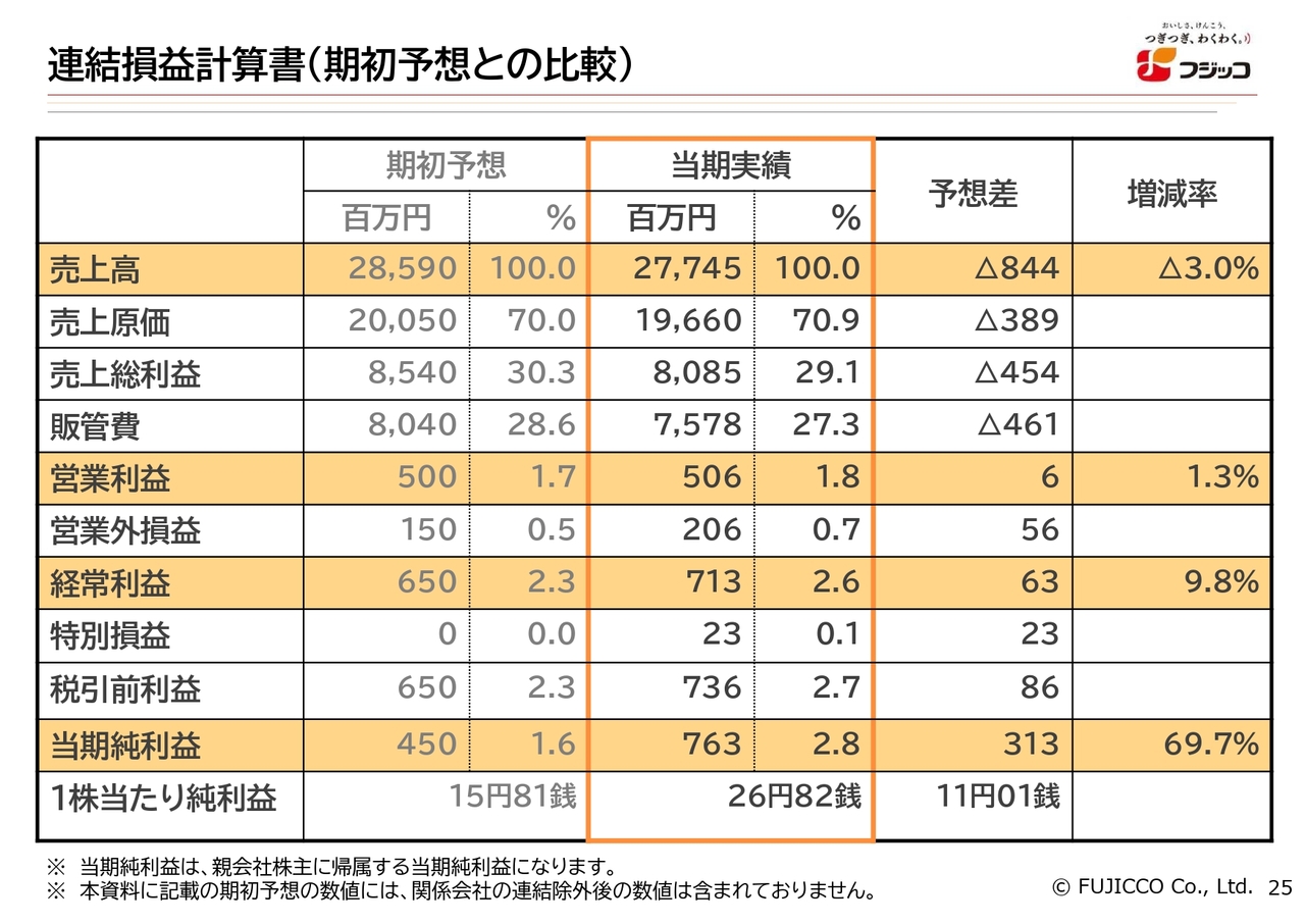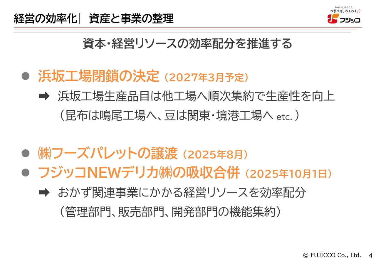 また、先ほど述べたとおり、株式会社フーズパレットの譲渡に加え、フジッコNEWデリカ株式会社の統合を実施しました。これらは、おかず関連事業の経営効率をさらに向上させることを目的とした意思決定です。
