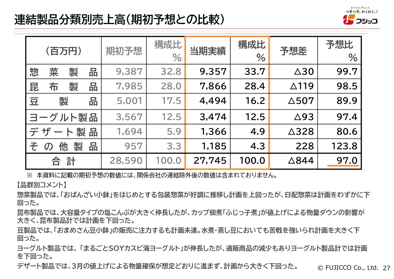 特に乖離が大きかった商品群は豆製品で、先ほど福井からもご報告したとおり、期初予想比でマイナス約5億円、89.9パーセントにとどまりました。今期は豆事業強化の2年目としてかなり高い設定値を掲げて臨みましたが、前年を少し下回る結果となり、このような乖離が発生しています。