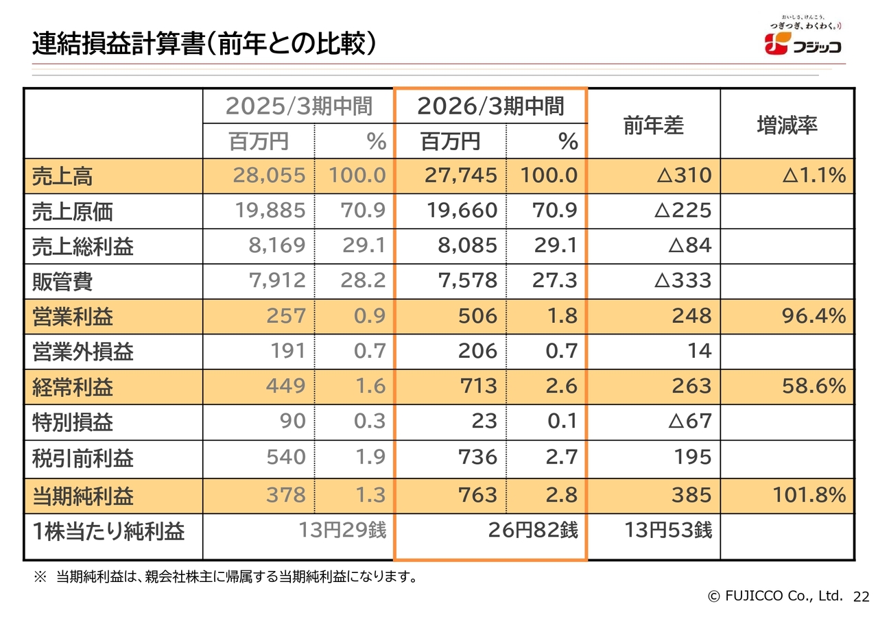 福井正一氏:フジッコ株式会社代表取締役社長執行役員の福井です。みなさま、本日は私どもの中間決算発表説明会にご参加いただき、ありがとうございます。まず、私からこの上期のトピックス、今後の方針や戦略についてお話しした後に、2026年3月期中間決算の概要と通期業績見通しについて発表します。