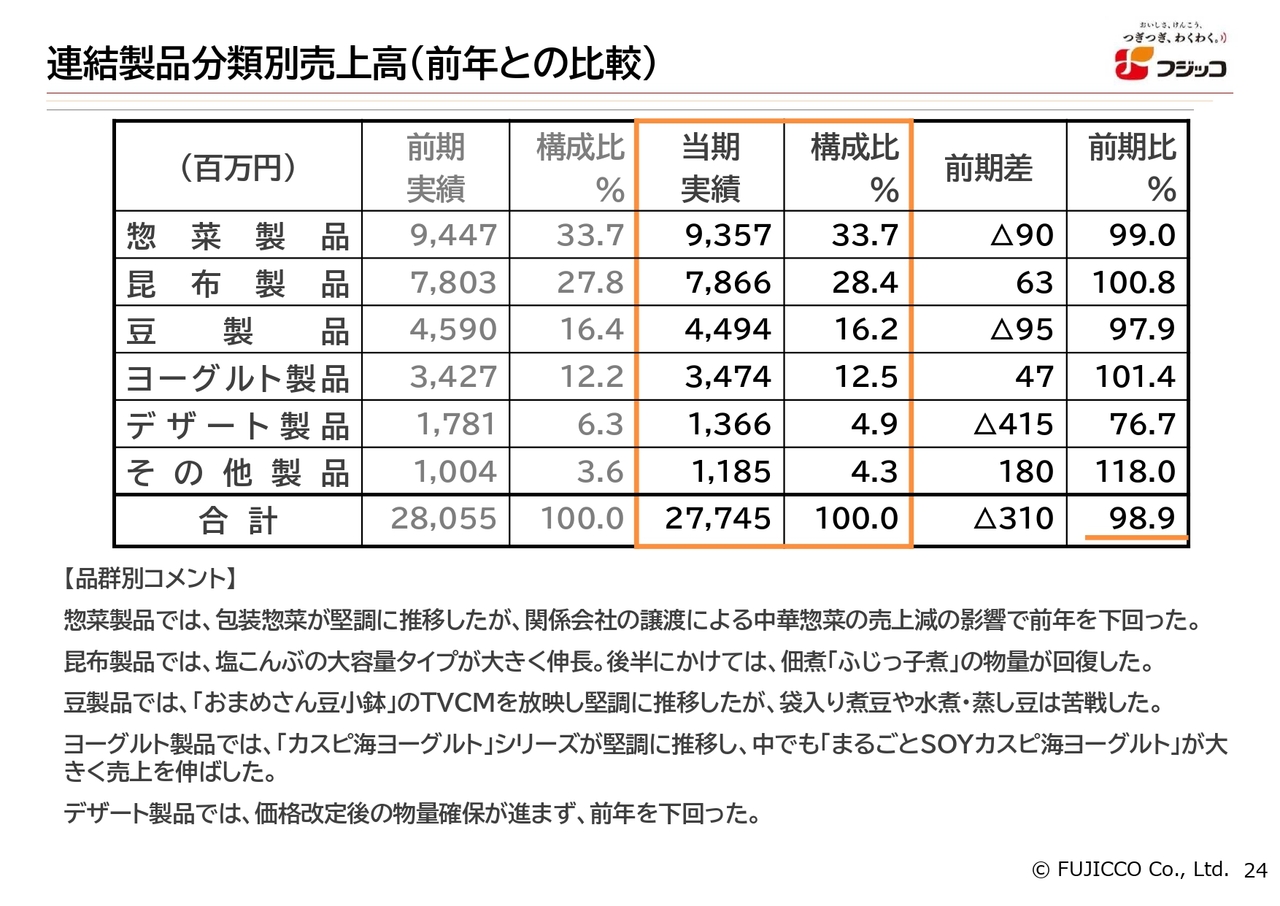 昆布製品は、春の値上げ時に一時的に物量が減少したと先ほどお伝えしましたが、その後回復傾向にあり、プラスとなっています。また、ヨーグルト製品は大豆ヨーグルトの伸長が全体を牽引し、プラスとなっています。