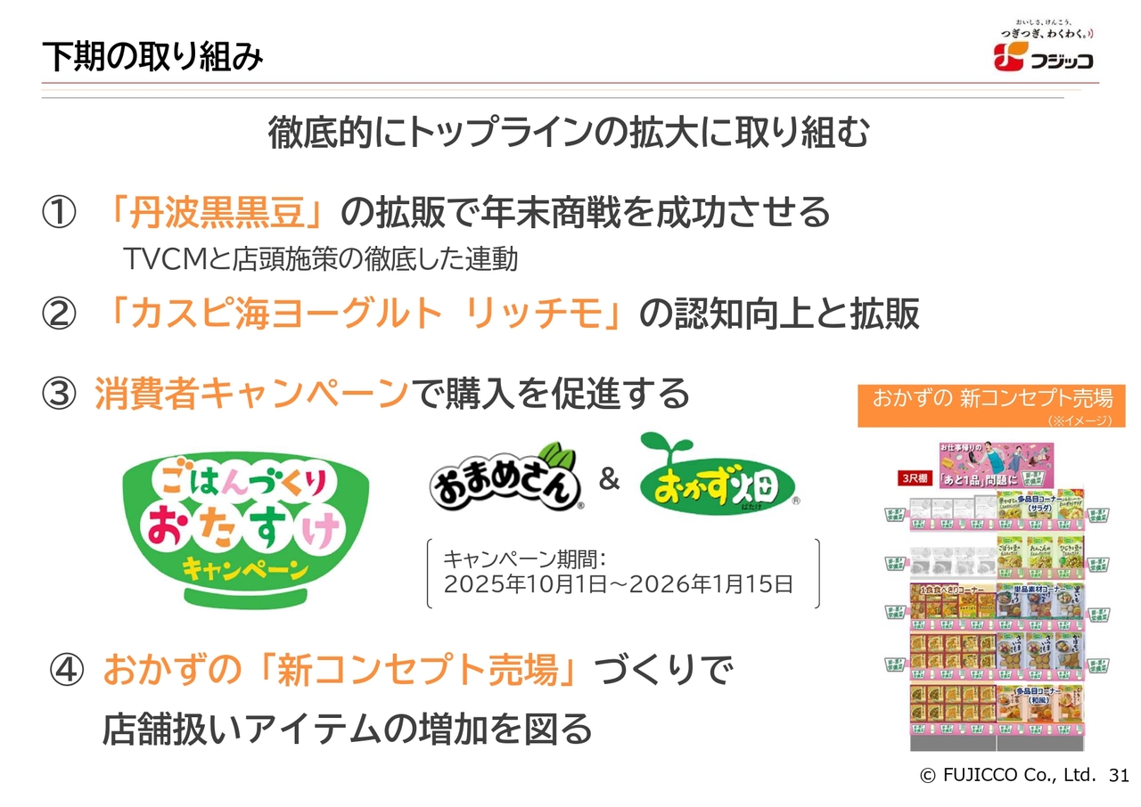 2つ目は、9月末に発売した「カスピ海ヨーグルト リッチモ」の認知向上と拡販です。まだ認知度が十分ではないため、PRなどを通じて認知拡大を図り、下期の成功に着実につなげる計画です。
