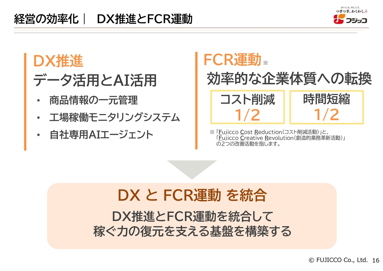 経営の効率化については、DXの推進とFCR運動を同時に展開していきます。FCRとは、コスト削減や新たな革新による事業展開、創造的業務革新の活動を指します。