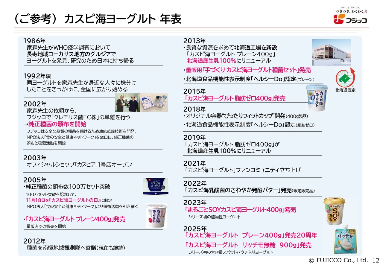 スライド右側の表に記載のとおり、2013年には北海道に工場を建設し、生乳100パーセントの牛乳を使用して「カスピ海ヨーグルト」を生産するに至りました。