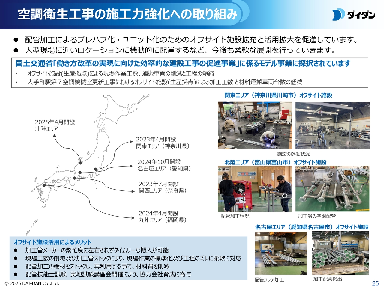 引き続き、大型現場の近くにスポット的にオフサイト加工施設を配置するなど、柔軟な施設展開を行い、さらなる施工力拡大と生産性改善に努めていきます。