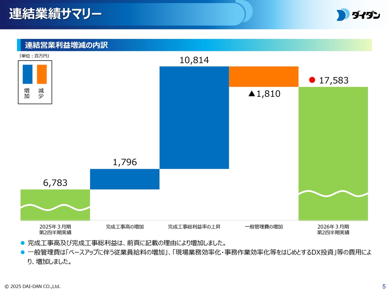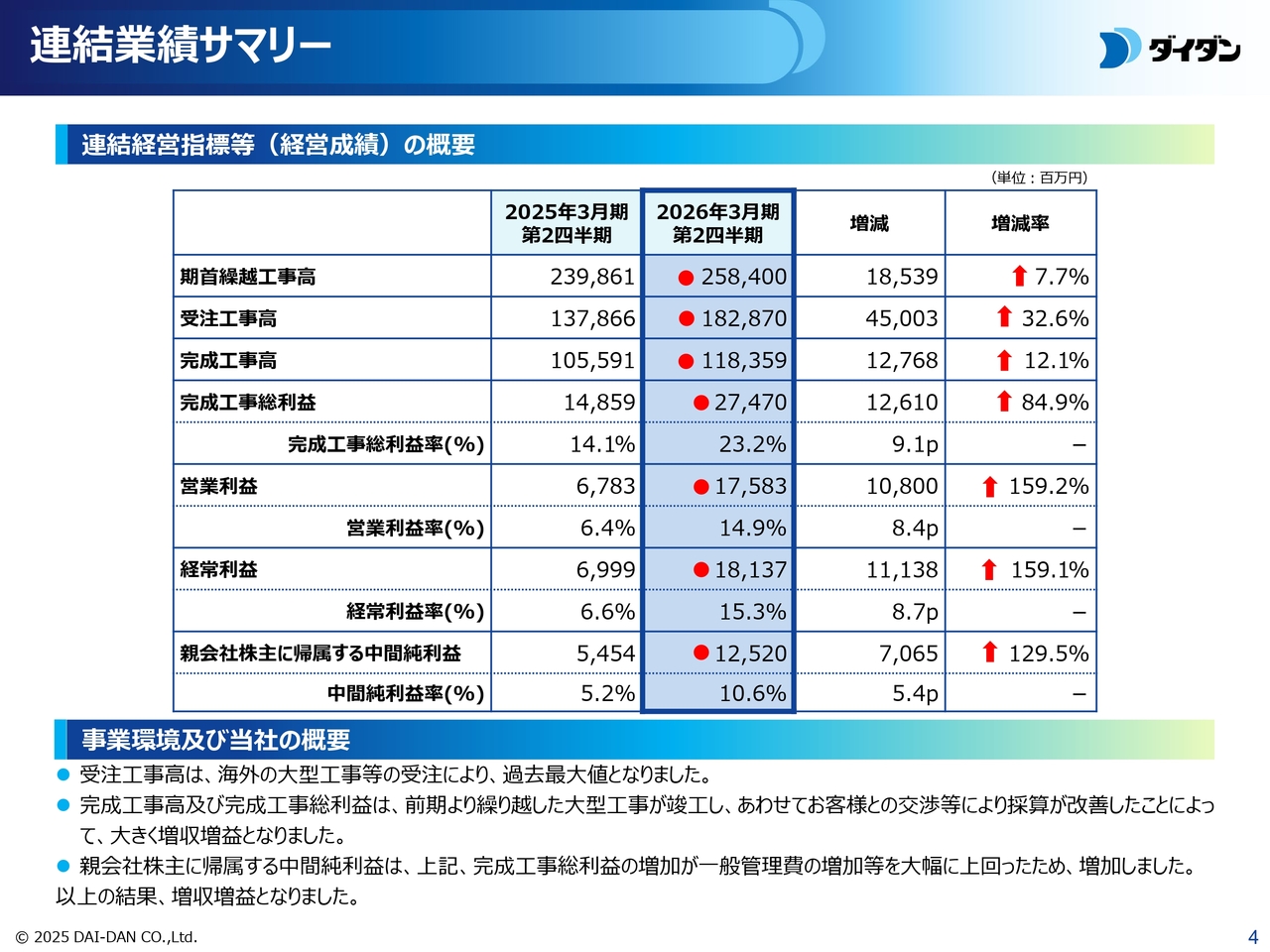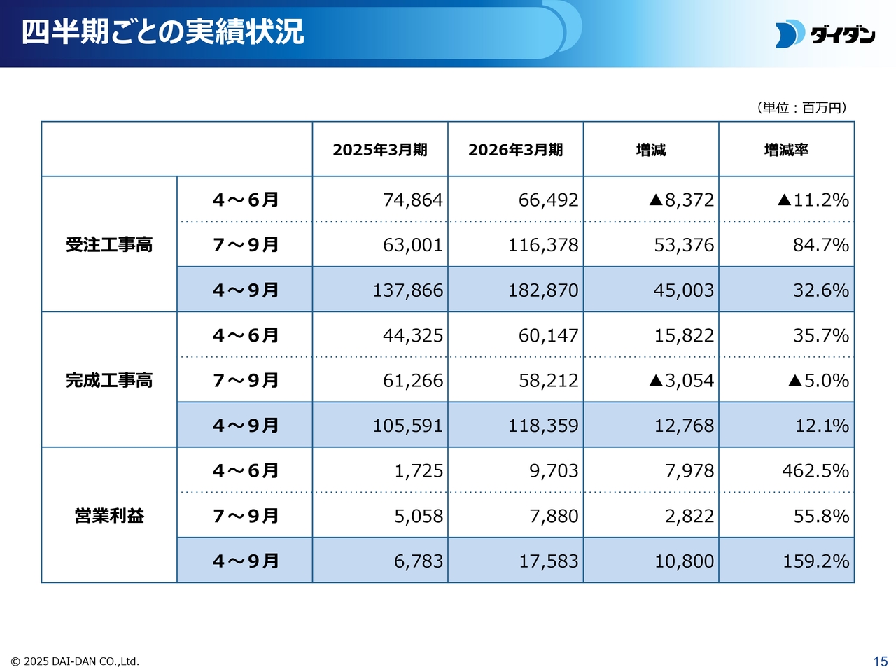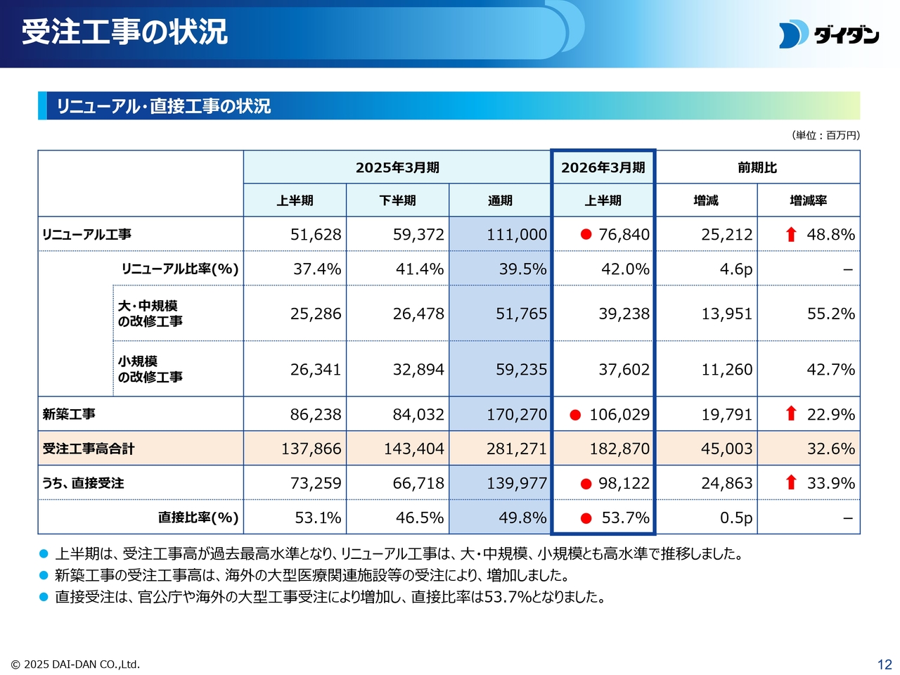 以上の結果、増収増益となり、第2四半期において受注工事高・完成工事高・営業利益ともに過去最高になりました。