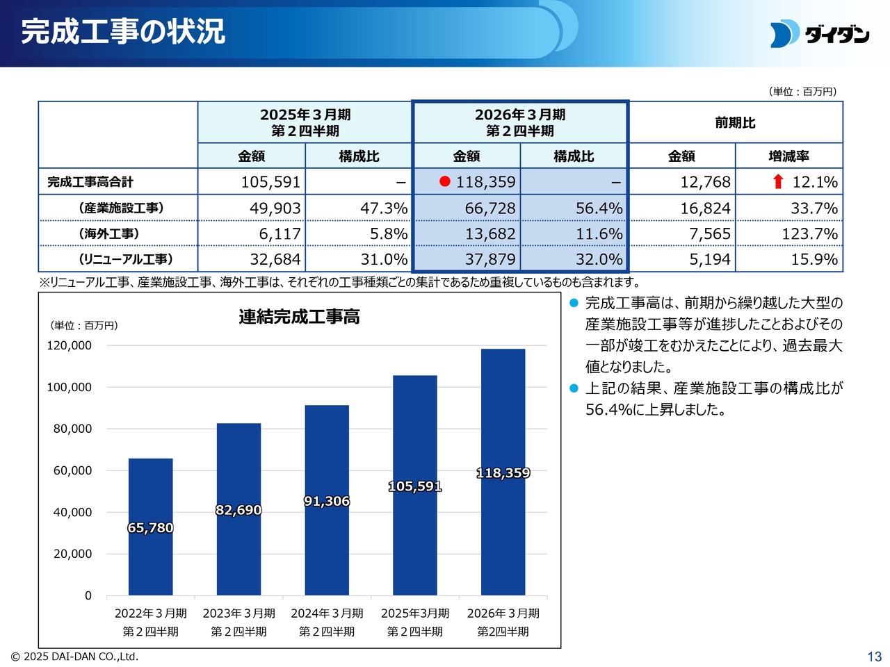 完成工事の状況についてご説明します。当期の完成工事高は、第2四半期に過去最大値となる1,183億5,900万円を記録となり、前期比で12.1パーセント増加しました。