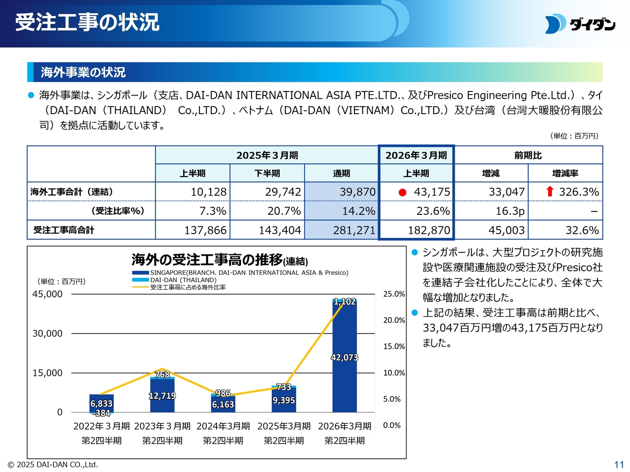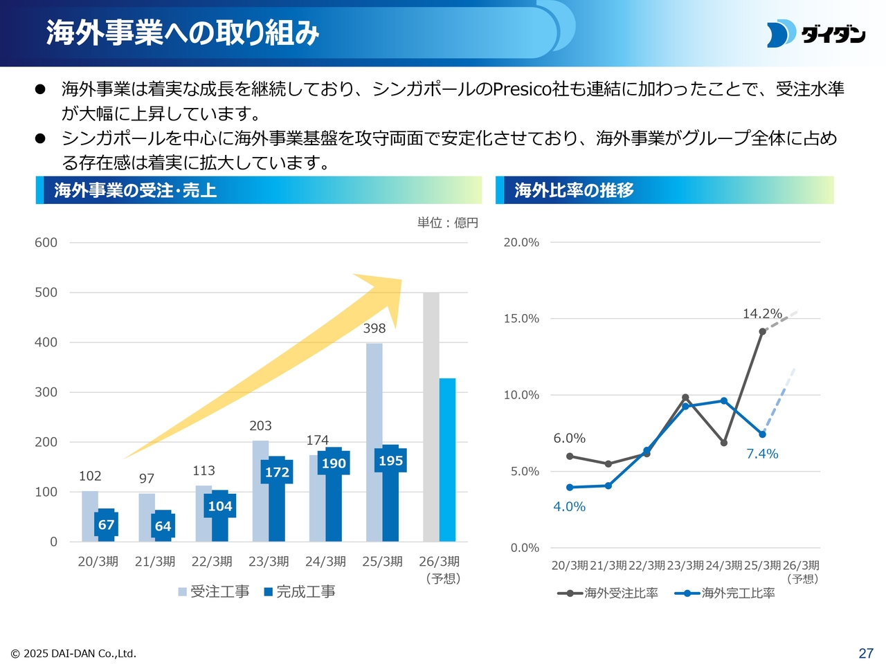 海外事業への取り組みについてご説明します。成長を牽引する事業として位置づけている海外事業は着実に拡大しており、シンガポールのPresico社も連結に加わったことで受注水準が大幅に増加しています。