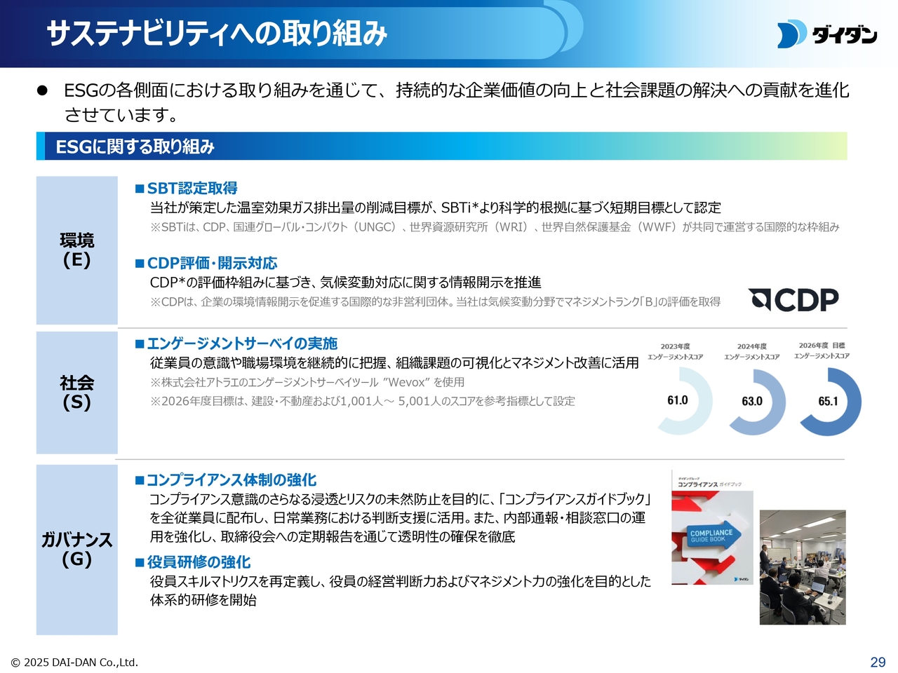最後に、サステナビリティへの取り組みについてご説明します。環境・社会・ガバナンスの各側面で、持続的な企業価値の向上と社会課題の解決に向けて、スライドのとおり具体的な施策を打ち出し、着実に進めています。