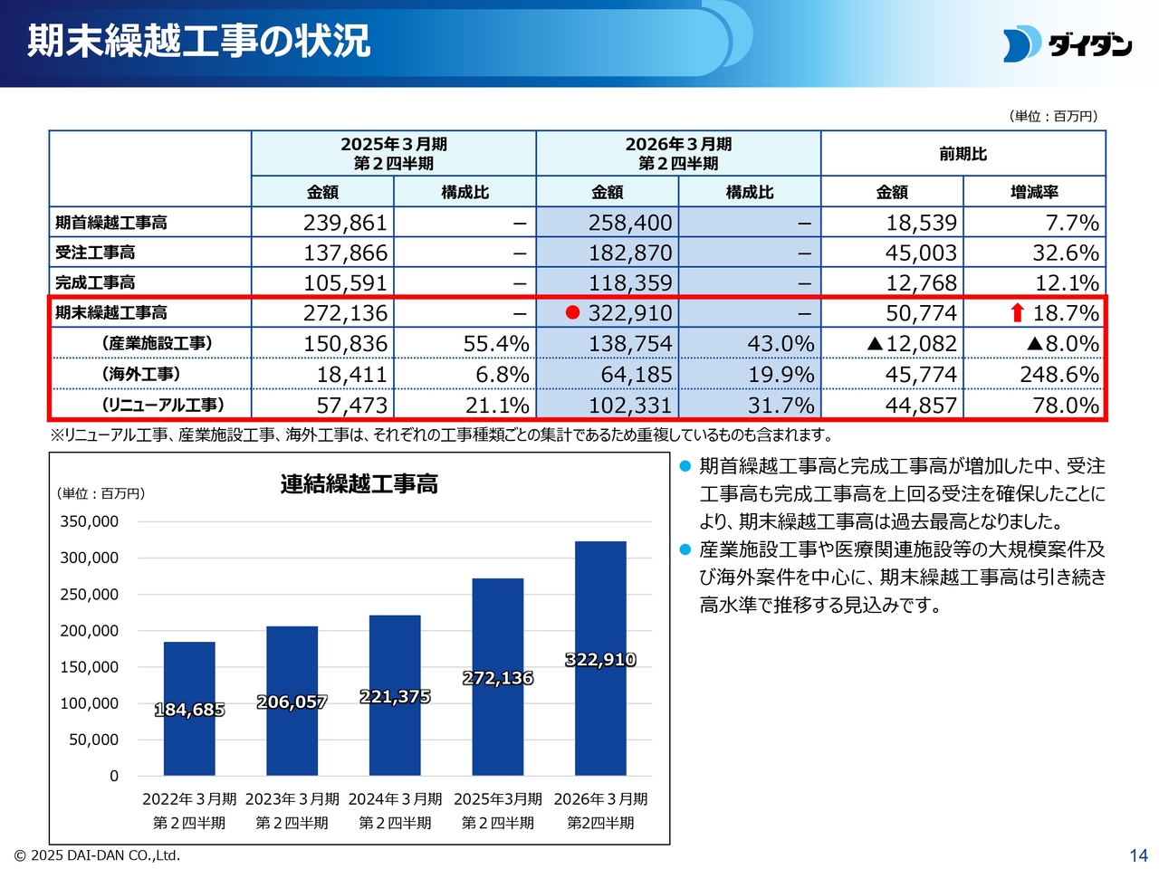 期末繰越工事の状況についてご説明します。期首繰越工事高と完成工事高が増加した中、受注工事高が完成工事高を上回る受注を確保したことにより、当期末の繰越工事高は3,229億1,000万円、前期比18.7パーセント増となり、第2四半期において過去最大値となりました。