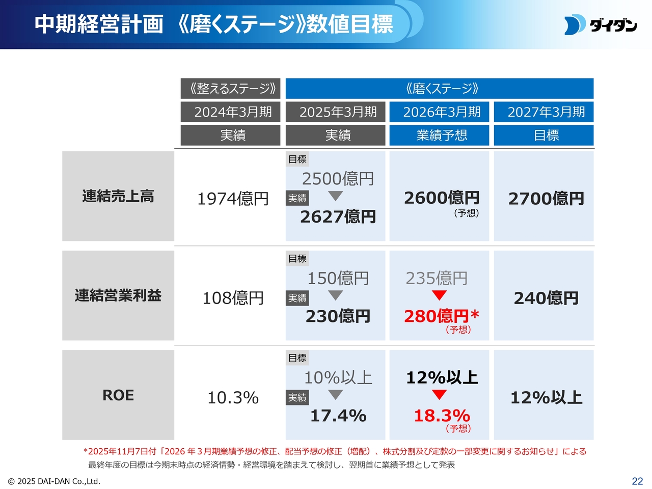 また、今年度の連結営業利益が最終年度の目標値を大幅に上回ると見込まれるため、「磨くステージ」の最終年度である2027年3月期の数値目標については、経済情勢や経営環境を踏まえて、翌期に開示する今年度本決算の中で業績予想として発表する予定です。