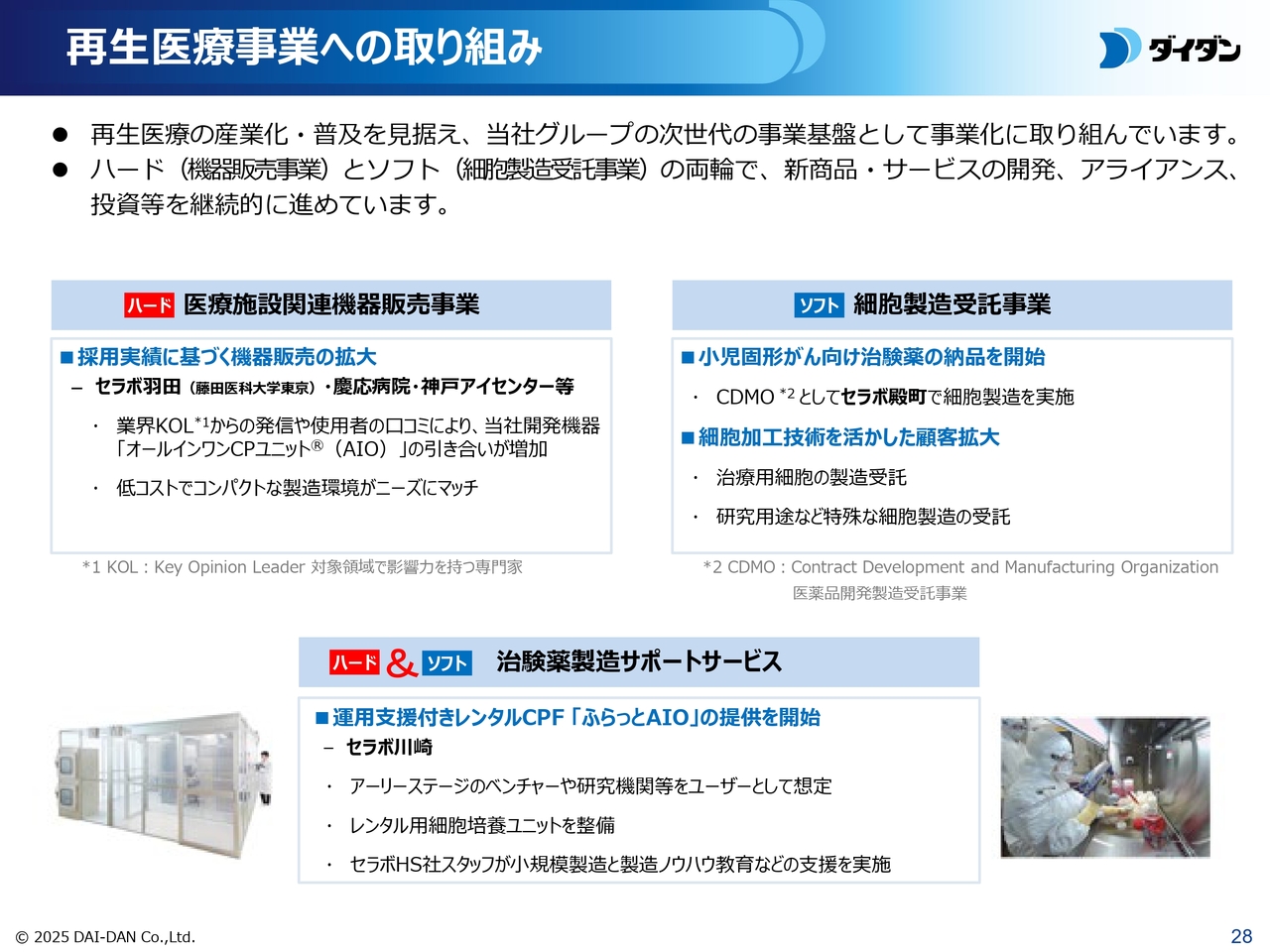 再生医療事業への取り組みについてご説明します。再生医療の産業化と普及を見据えて、細胞培養に適した環境を提供する「機器販売事業」と、細胞治験薬の製造を受託する「細胞製造受託事業」の両輪で事業化に取り組んでいます。