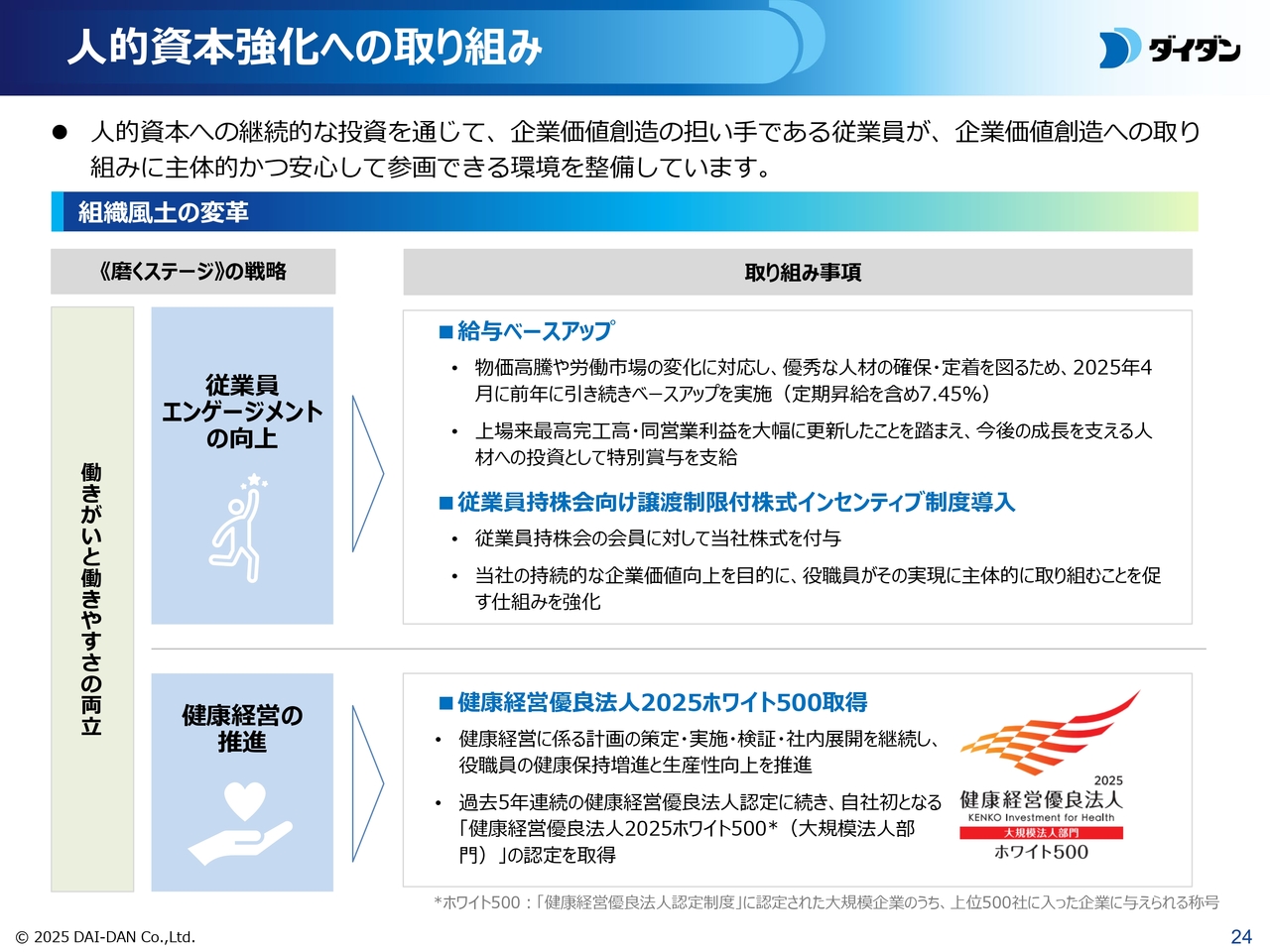 加えて、役職員の健康づくりに資するさまざまな施策が評価され、「健康経営優良法人2025」の大規模法人部門で「ホワイト500」に認定されました。