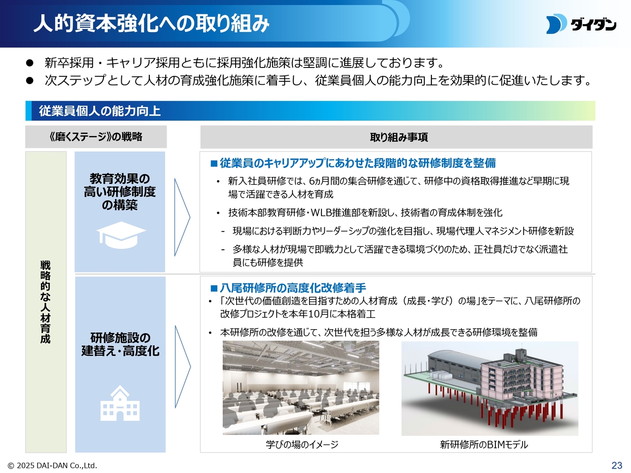 具体的には、キャリアの段階に応じた研修制度を整備し、実務に直結する知識や技術を習得できる機会を充実させています。また、人材育成の拠点である八尾研修所の高度化改修工事にも着手しました。