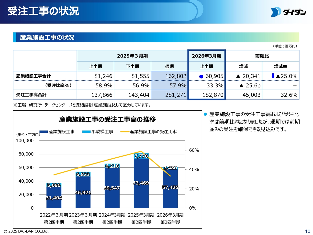 上半期の産業施設工事は609億500万円で、前期比25パーセント減少しましたが、通期では前期並みの受注を確保できる見込みです。