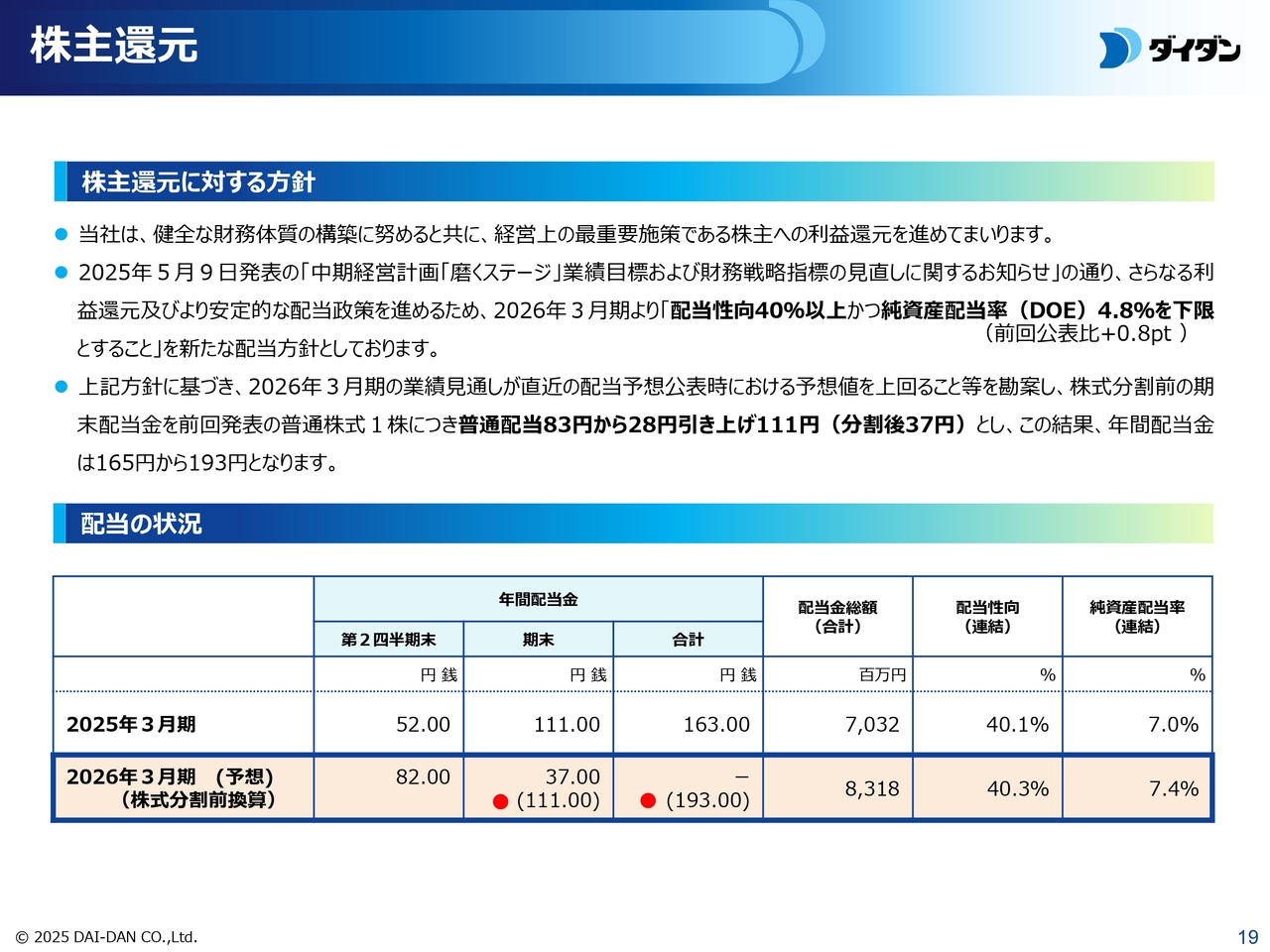 また、2025年5月9日発表の「中期経営計画『磨くステージ』業績目標および財務戦略指標の見直しに関するお知らせ」のとおり、さらなる利益還元ならびにより安定的な配当政策を進めるため、2026年3月期より「配当性向40パーセント以上かつ純資産配当率(DOE)4.8パーセントを下限とすること」を新たな配当方針としています。
