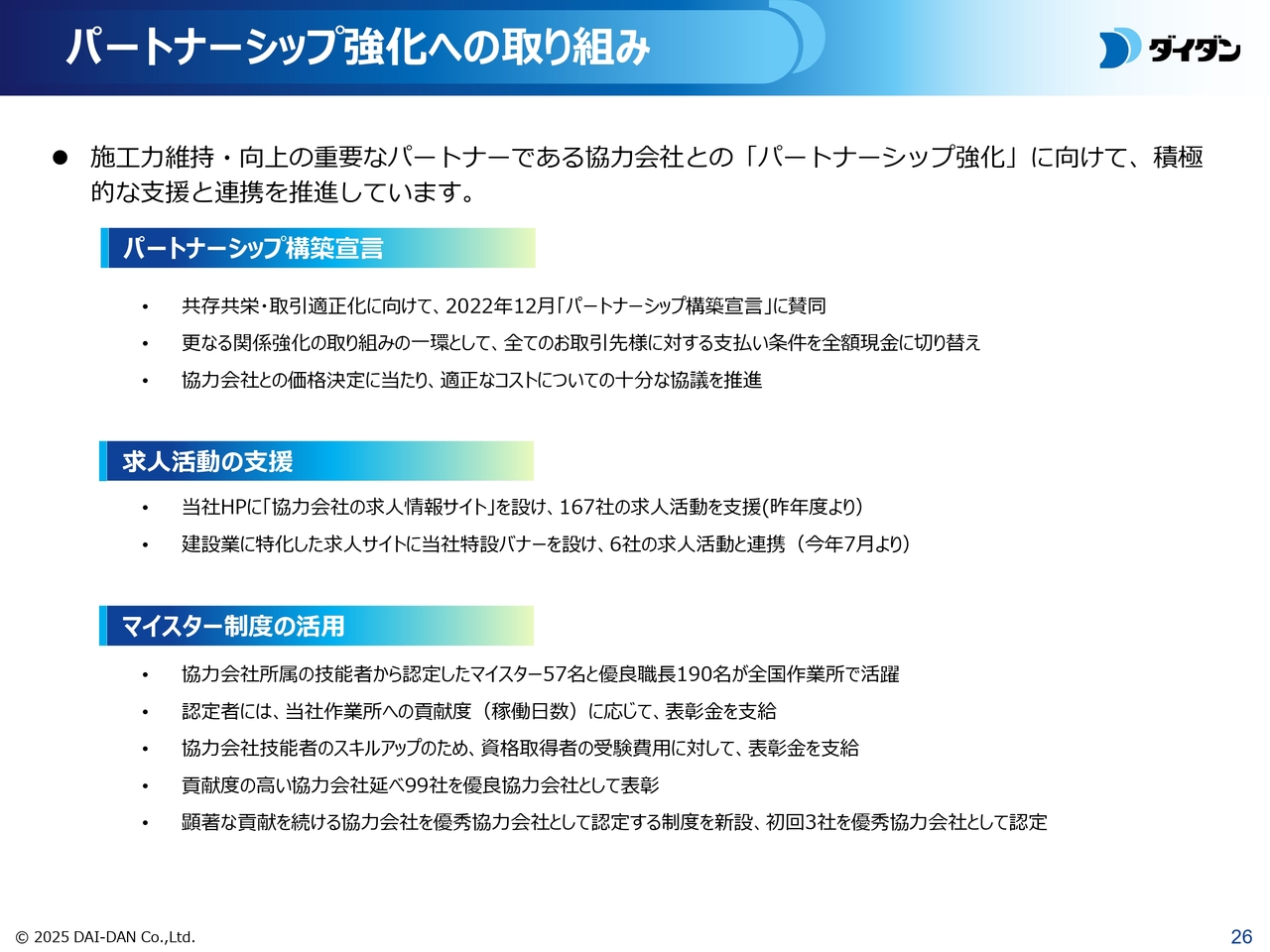 また、協力会社の求人活動支援や、技能者を表彰するマイスター制度の活用を通じて、協力会社との連携強化に取り組んでいます。