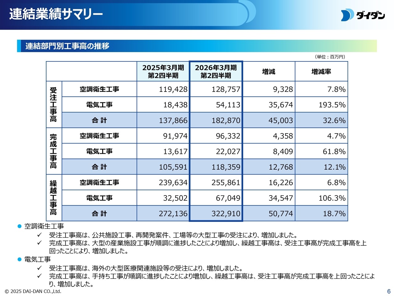 全項目、各工事部門において前期比増となりました。詳細については、2025年11月7日公表の資料をご参照ください。