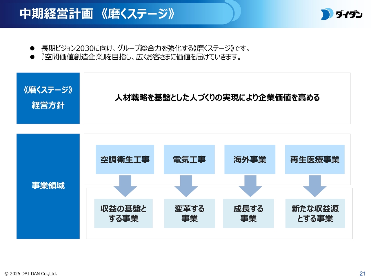 「磨くステージ」では、「人材戦略を基盤とした人づくりの実現により企業価値を高める」を経営方針とし、持続性のある人的資本強化に注力しています。
