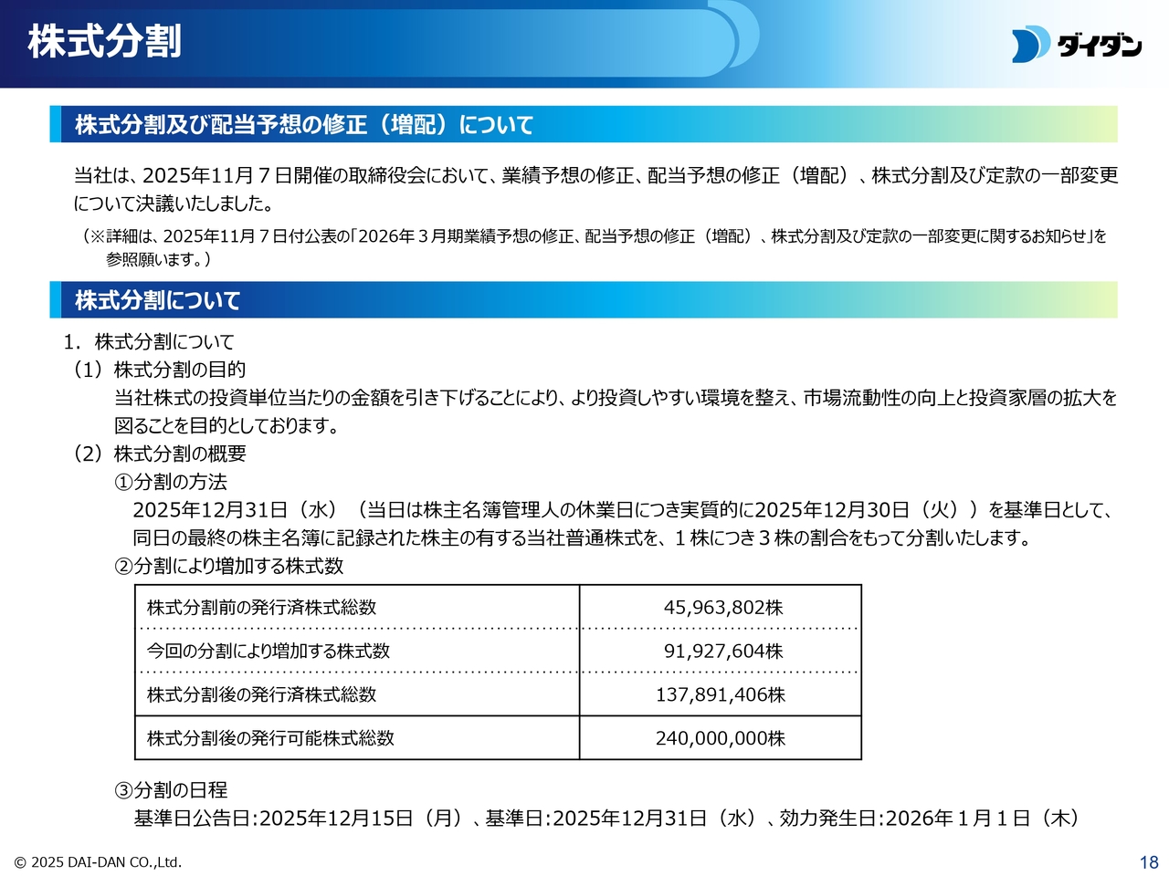 株式分割および配当予想の修正についてご説明します。当社は2025年11月7日開催の取締役会において、株式分割および定款の一部変更を決議しました。また、最近の業績の動向等を踏まえ、2026年3月期の業績予想および配当予想を修正しました。