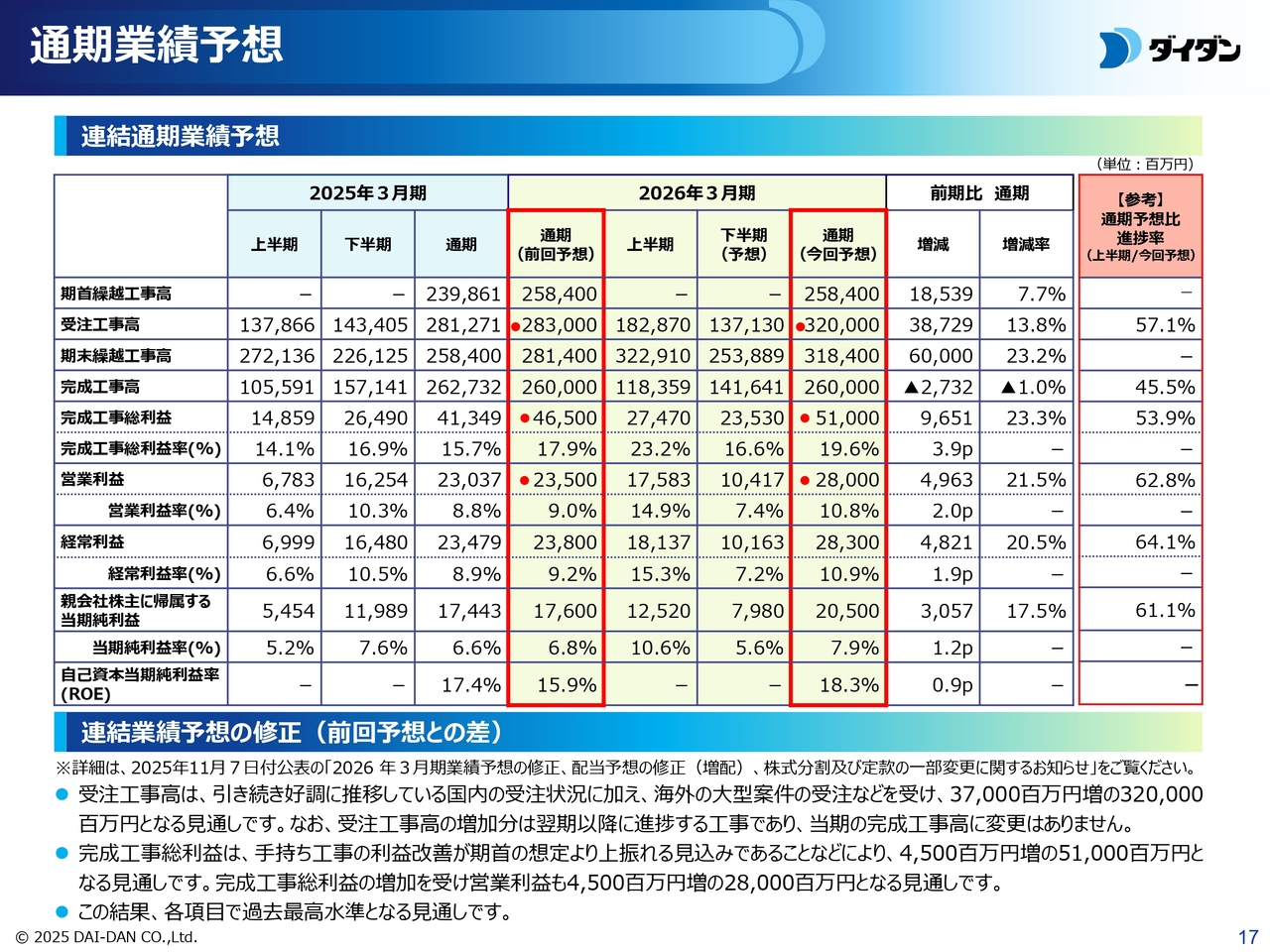 なお、先ほどご説明した受注工事高の増加は、翌期以降に進捗する工事の受注によるものであるため、完成工事高は前回公表時からの変更はありません。