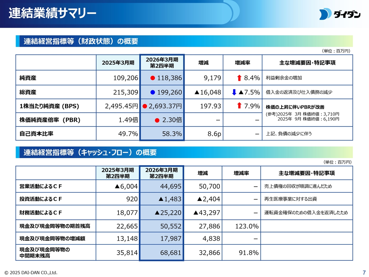 売上債権の回収が順調に進んだことによる営業キャッシュ・フローの増加が、再生医療事業に対する出資による投資キャッシュ・フローの減少および運転資金確保のための借入金返済による財務キャッシュ・フローの減少を上回ったことにより、現金および現金同等物の中間期末残高は、期首残高505億5,200万円から179億8,700万円増加し、686億8,100万円となりました。