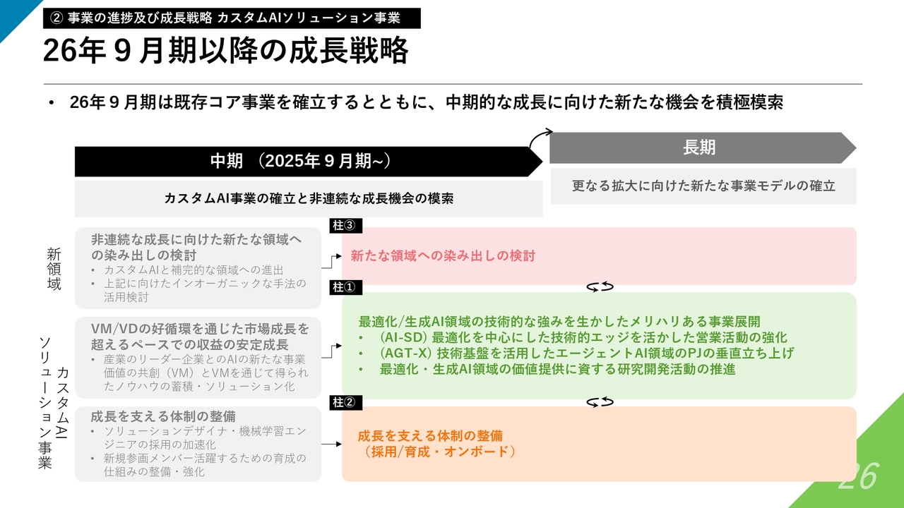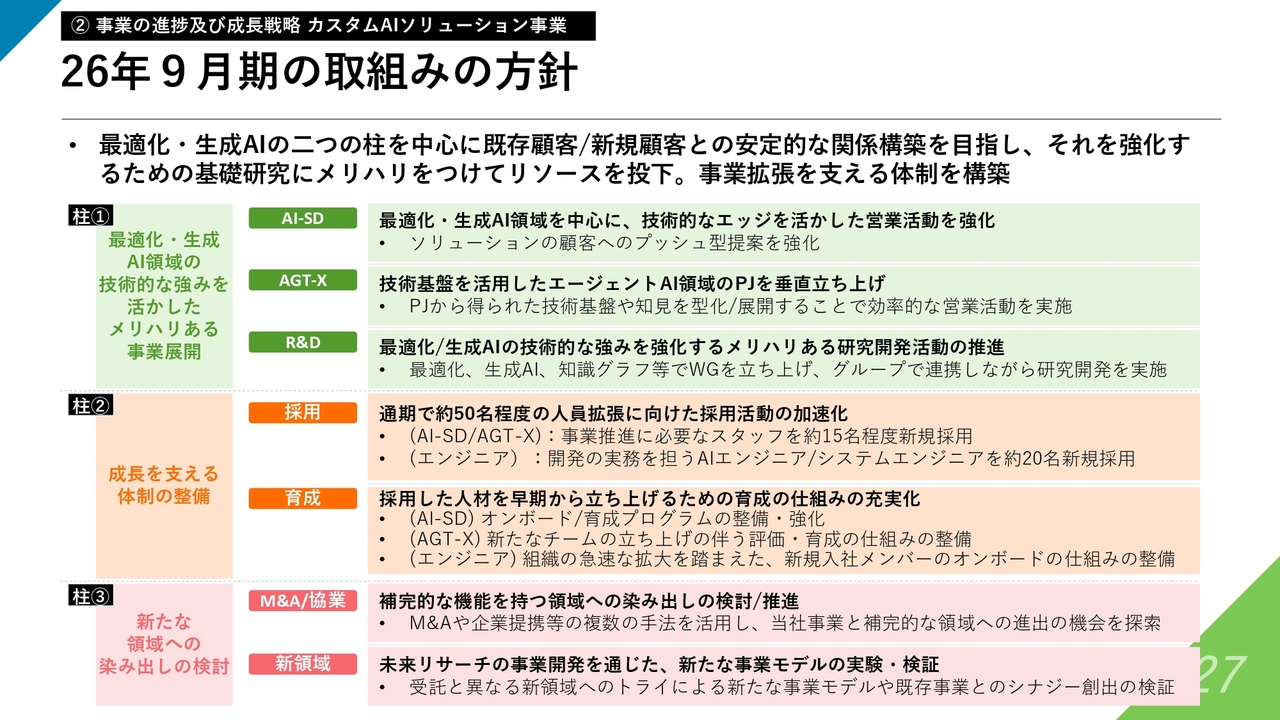 大きな①②③の柱は引き続き変わりませんが、特に柱①については、冒頭でも少し触れたように、最適化技術および生成AIの技術領域に焦点を当て、これらの強みを活用してメリハリのある事業展開を進めていきます。新たにこちらを2026年9月期およびその先に向けて、強く推し進めていきたいと考えています。