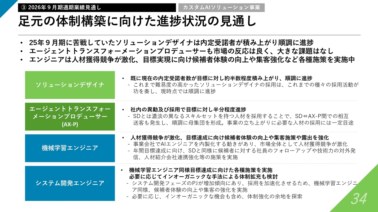 次に体制についてです。課題として、先ほど触れたとおり、ソリューションデザイナの採用が計画に届かなかった点が挙げられます。一方、足元では少し良いかたちで進展してきている状況もあり、2026年9月期までにしっかり挽回していきたいと考えています。