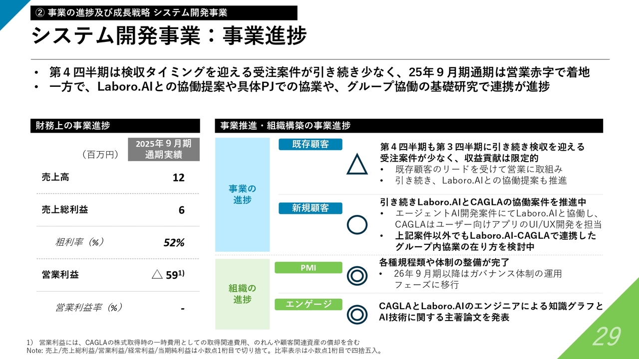 システム開発事業についてです。システム開発事業の進捗状況については、冒頭の総括でも触れたとおり、全体への数字上の貢献は限定的な部分があるものの、一定想定どおりの結果となっています。