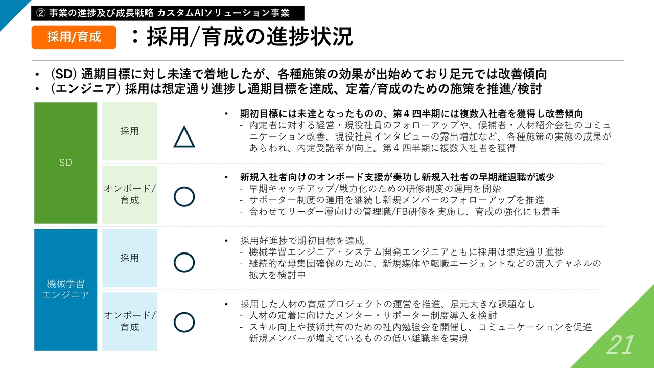 採用・育成についてです。繰り返しになるため詳細は割愛しますが、ソリューションデザイナの採用において課題が顕在化しました。ただし、後ほど触れますが、足元では少し改善しつつある状況です。