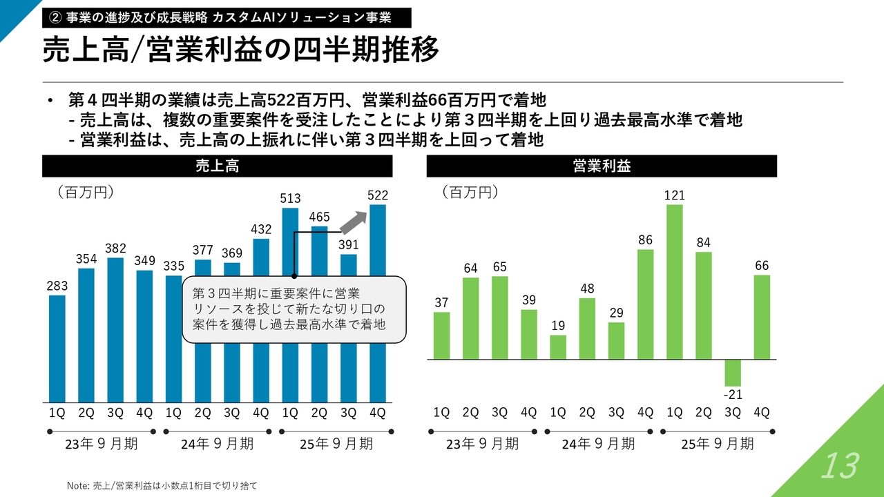 売上高と営業利益の四半期推移についてです。第4四半期のカスタムAIソリューション事業の売上高は5億2,200万円となり、過去最高水準で着地しました。営業利益についても、第3四半期は一時的に赤字となりましたが、第4四半期には黒字に戻っています。