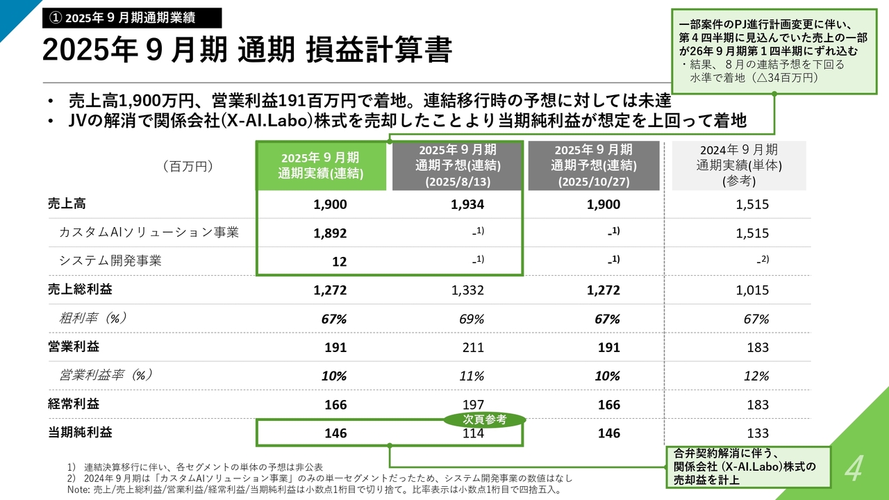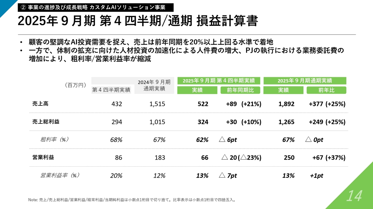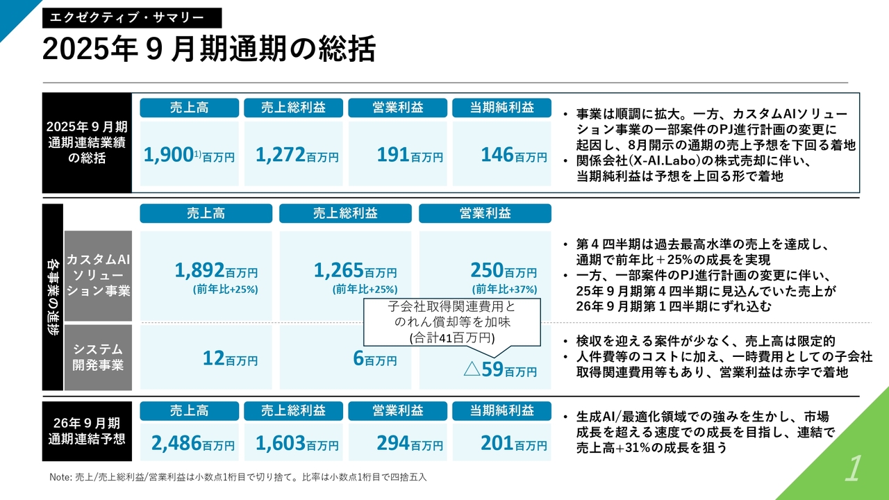 事業全体は順調に拡大しましたが、8月に開示した連結売上予想に対してはわずかに下回る結果となりました。要因は、後ほど触れるカスタムAIソリューション事業において、いくつかのプロジェクトで進行計画に変更があり、計上タイミングが2026年9月期第1四半期にずれ込んだためです。