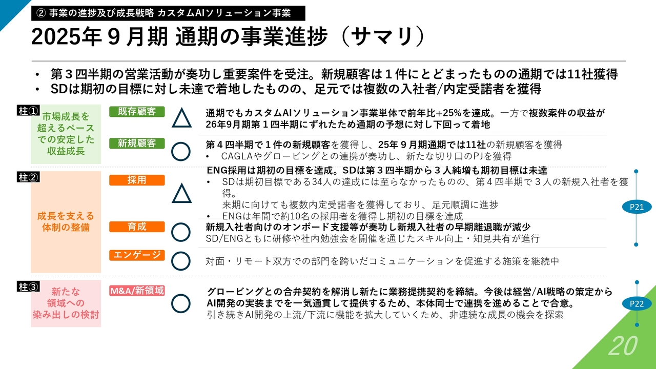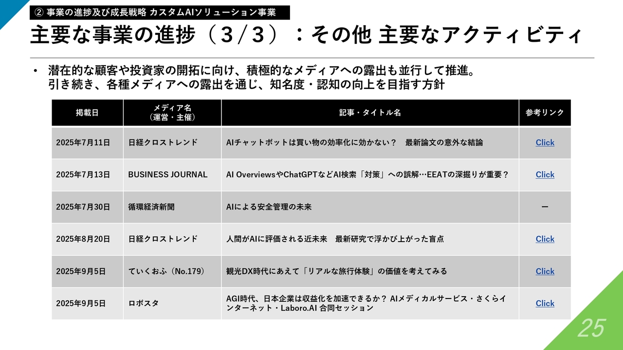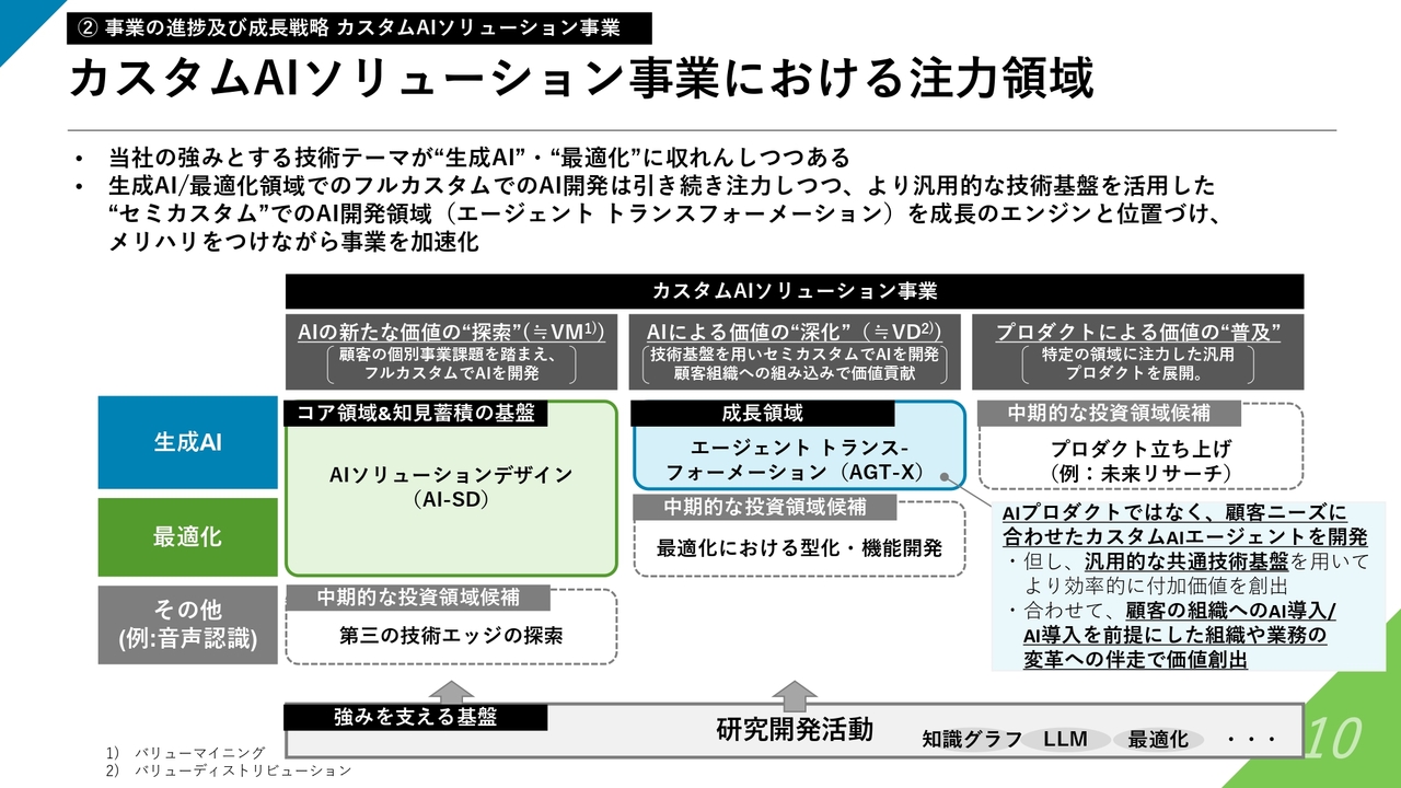 カスタムAIソリューション事業の2025年9月期の進捗および進展を振り返ると、大きく2つ、定性的な進展が見えてきていると捉えています。また、今後の戦略については、振り返りを基に考えをさらに発展させています。