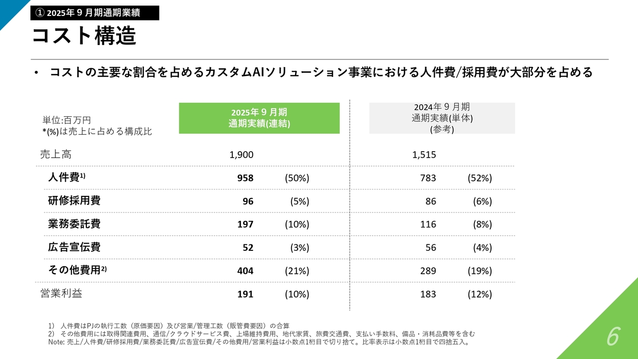 コスト構造についてです。スライド右側の2024年9月期と比較して大きな変化はなく、引き続き人件費と研修採用費が全体の半分を超えるコストとなっています。